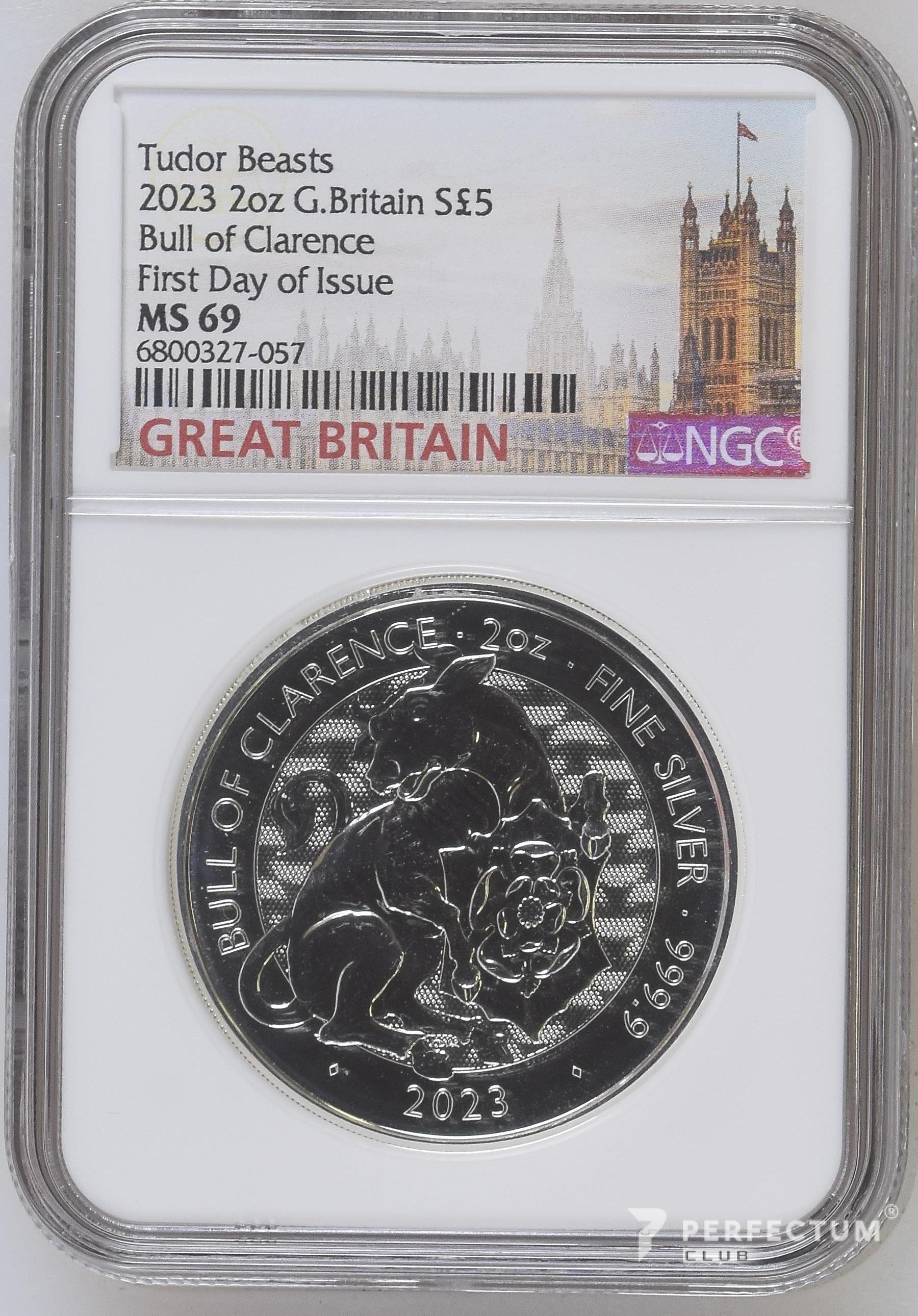 5 фунтів — Карл III (Бик Кларенса; 2 унції чистого срібла) 2023 ms69 ngc