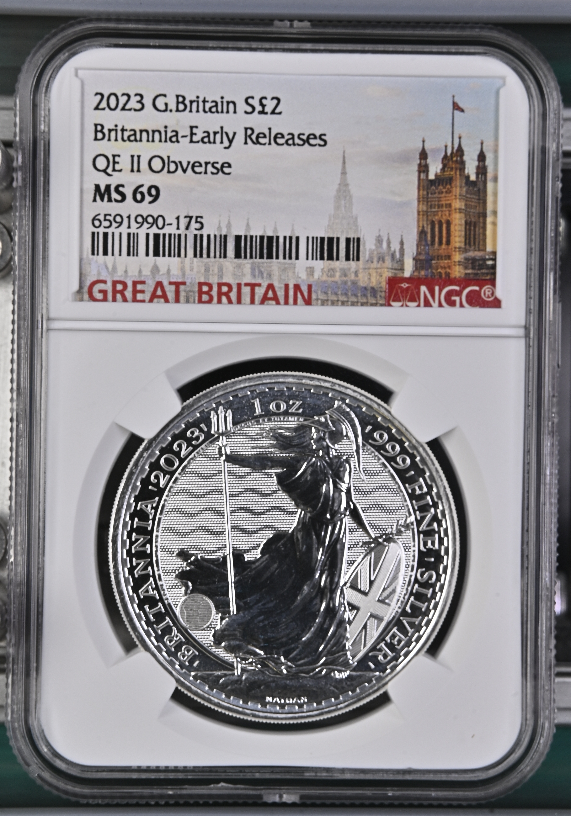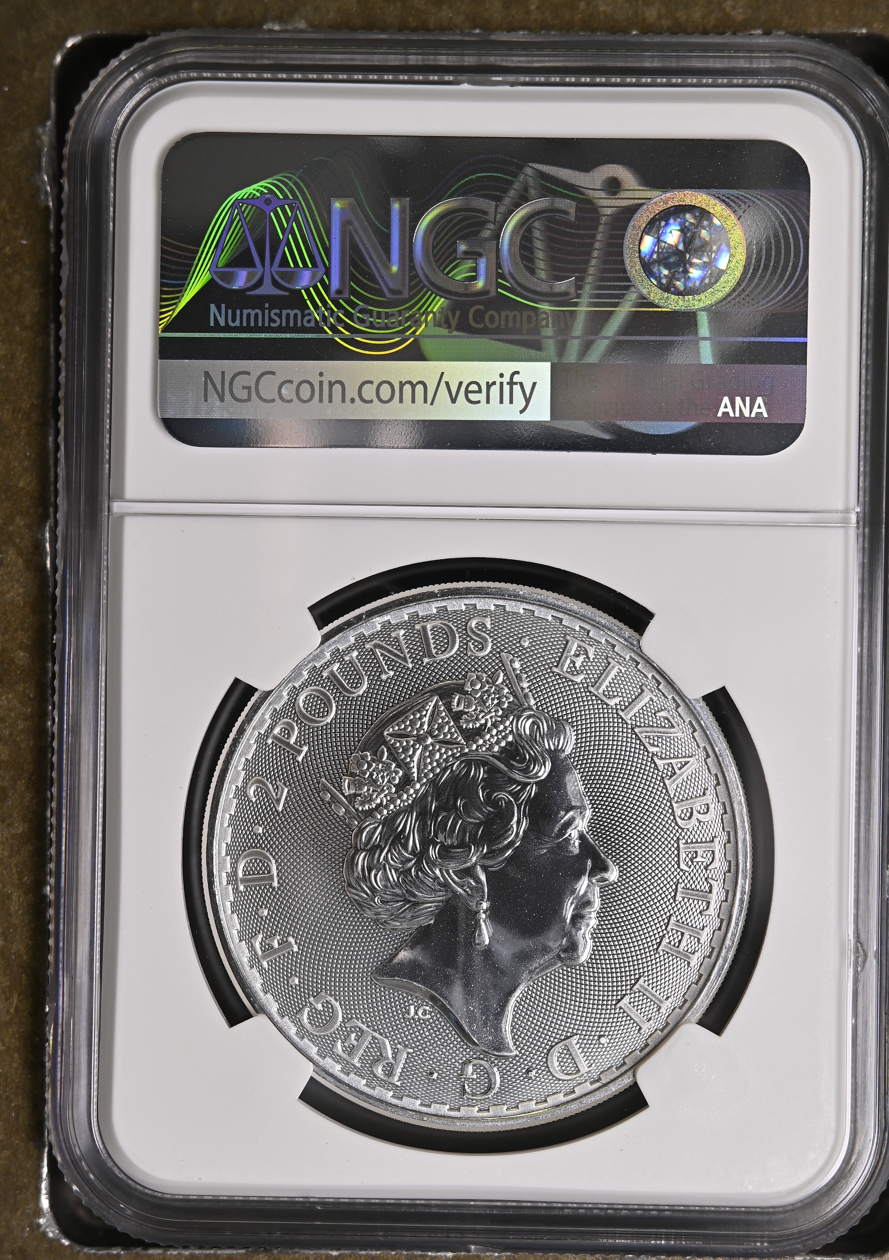 2 фунти — Єлизавета II (5-й портрет; 1 унція чистого срібла) 2023 ngc ms69