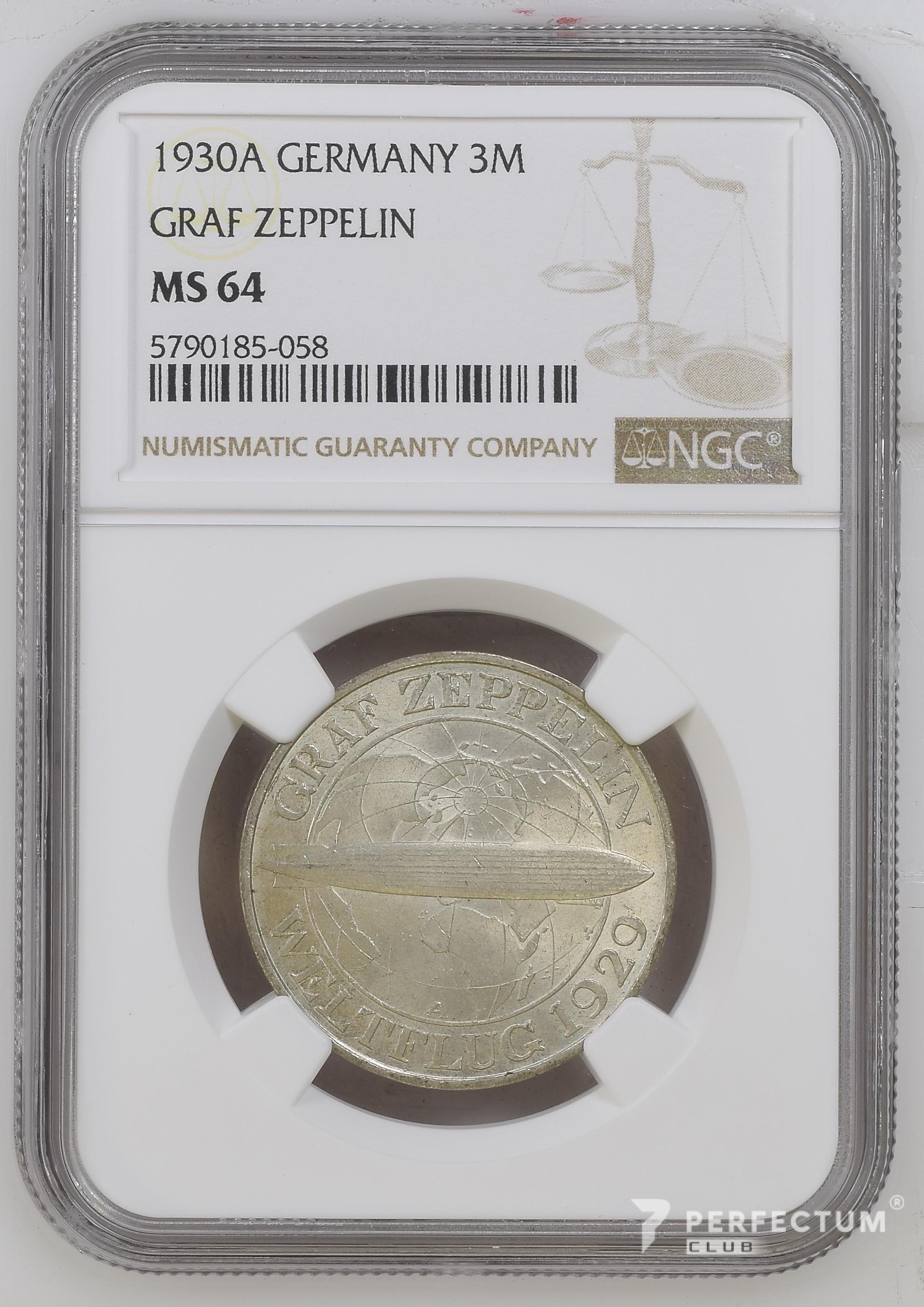 3 марки 1930 г. A, NGC MS64, "Полёт дирижабля "Граф Цеппелин"