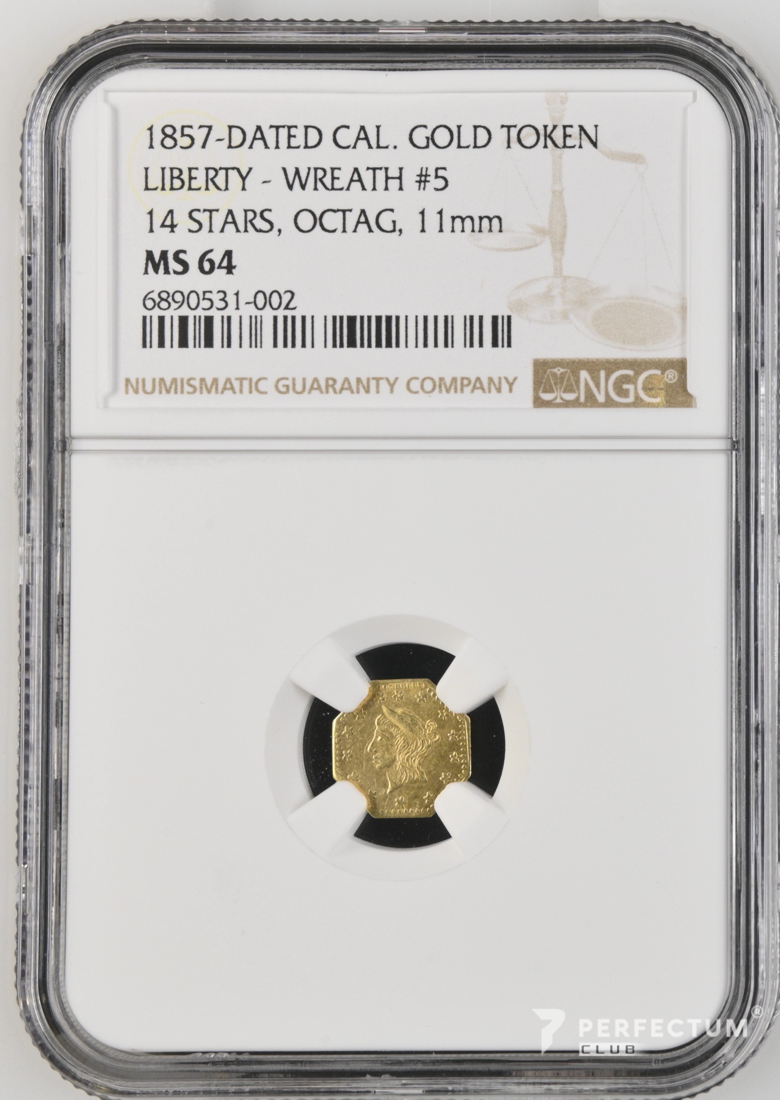 1857 CAL. GOLD LIBERTY - WREATH #5 14 STARS, OCTAG, 11mm TOKEN ngc ms64