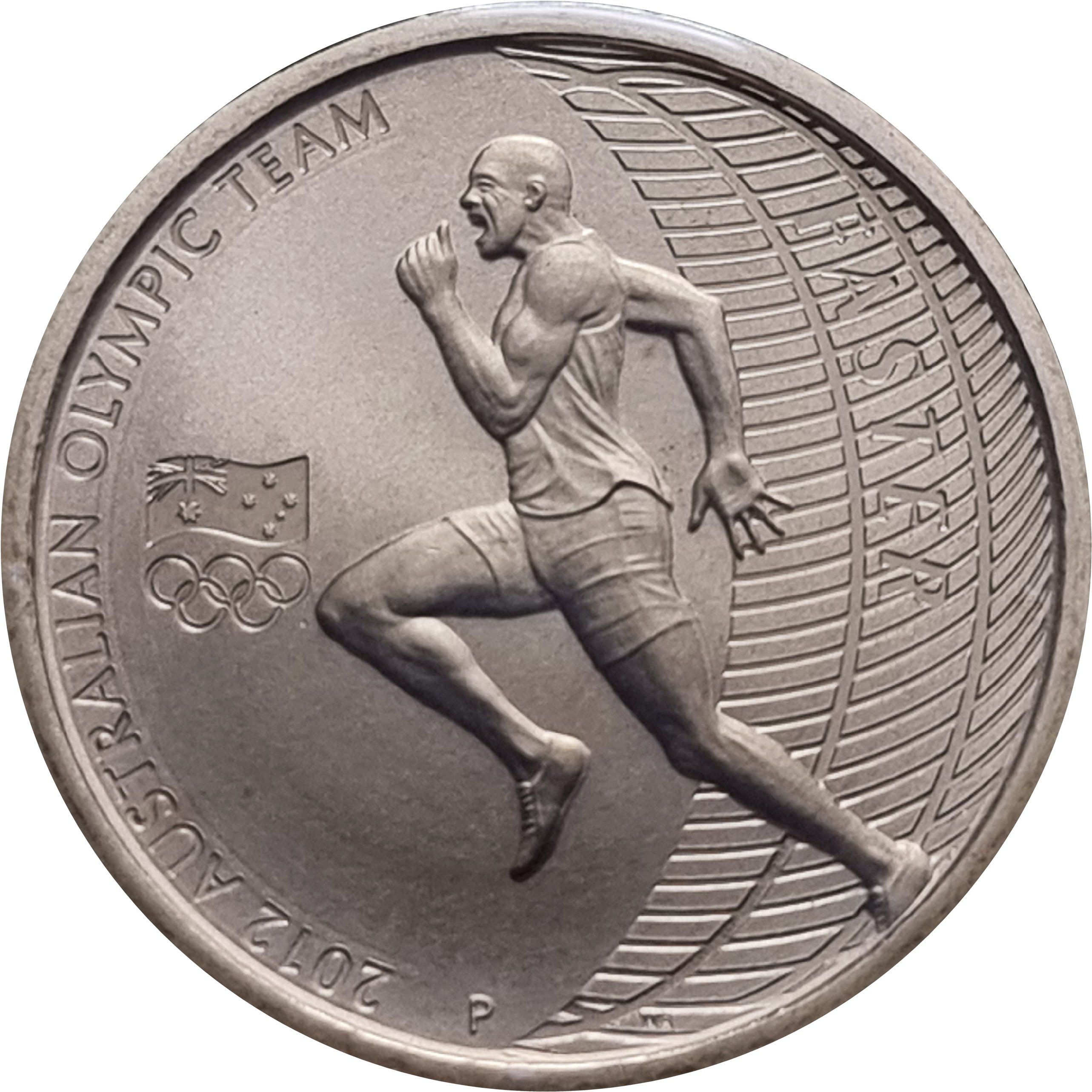 Описание: На монете изображен олимпийский бегун на фоне слова FASTER. Дизайн включает официальный логотип команды и надпись 2012 AUSTRALIAN OLYMPIC TEAM.