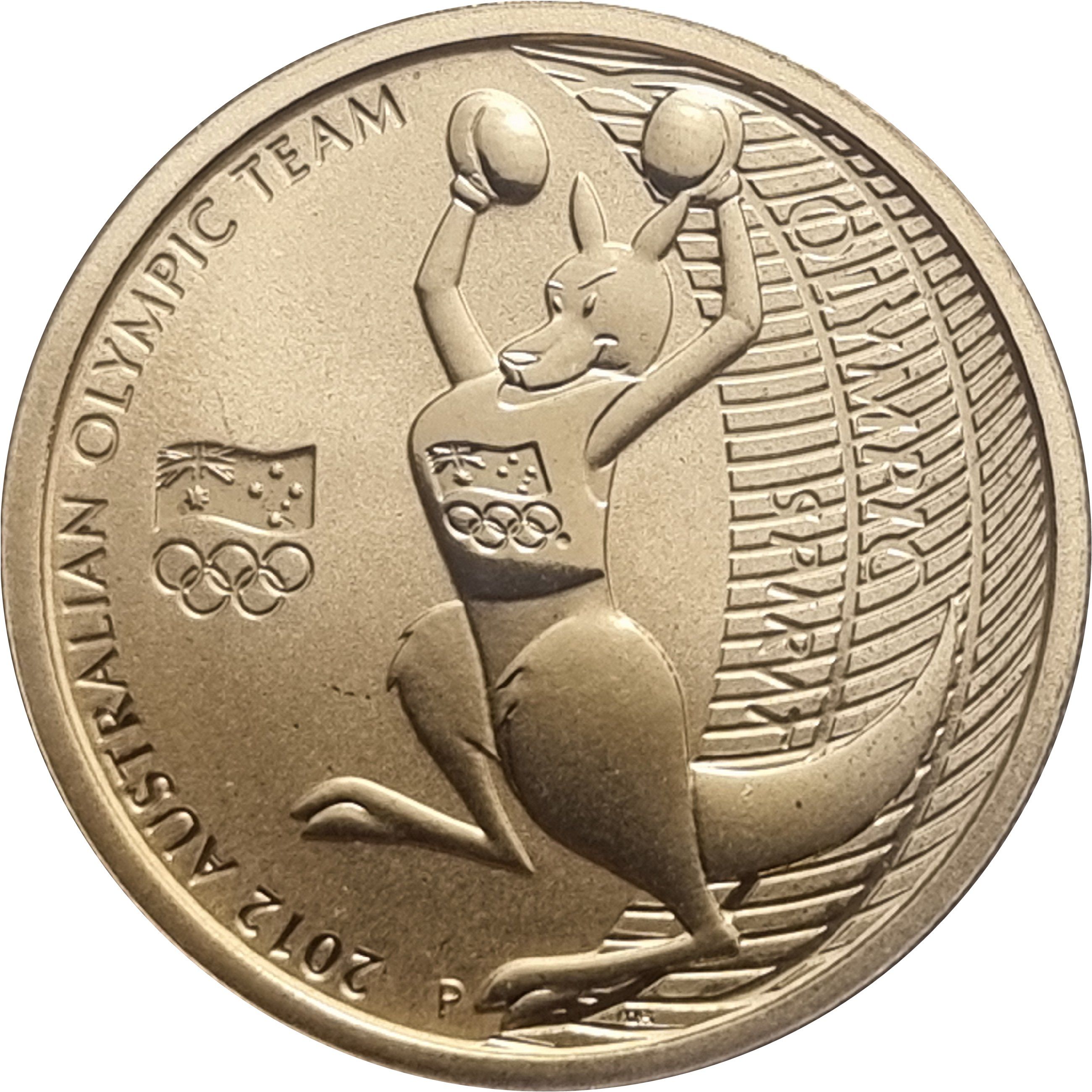 Описание: На монете изображен талисман австралийской олимпийской сборной — боксерский кенгуру — на фоне надписи «OLYMPIC SPIRIT» (Олимпийский дух). Дизайн включает официальный логотип сборной и надпись «2012 AUSTRALIAN OLYMPIC TEAM» (Австралийская олимпийская сборная 2012 года).