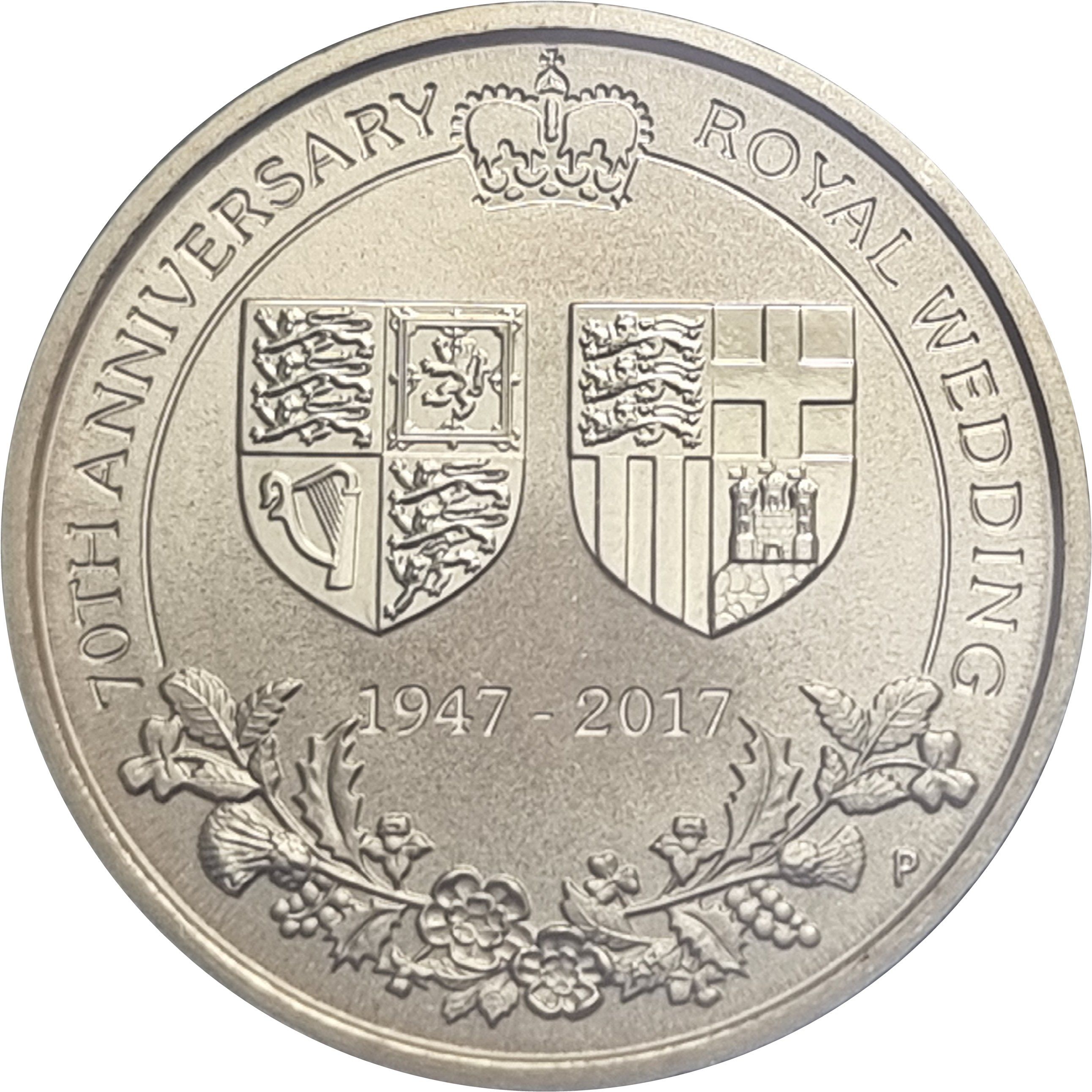 Описание: Щит из королевского герба Соединенного Королевства рядом со щитом из герба Его Королевского Высочества принца Филиппа, герцога Эдинбургского. Дизайн также включает цветочные эмблемы Уэльса, Шотландии, Ирландии и Англии, а также корону Святого Эдуарда.