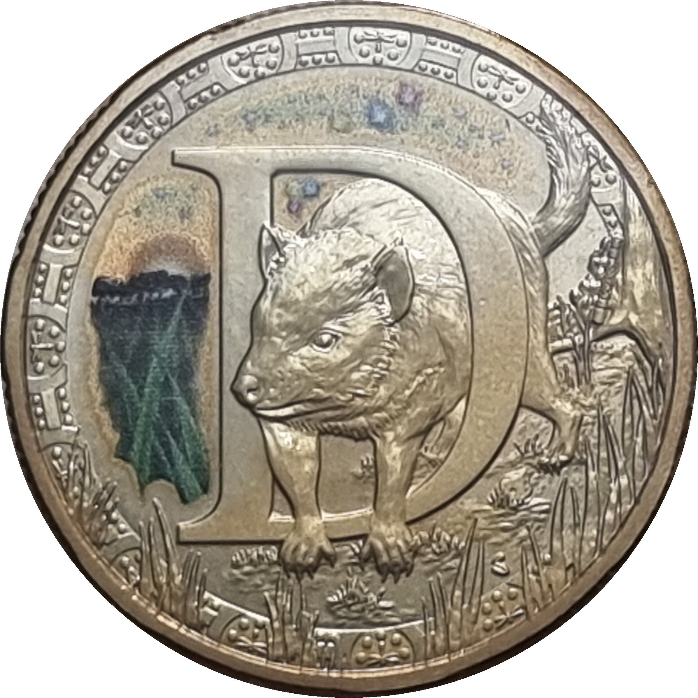 Описание: На монете с буквой D изображен динамичный, драматичный и проницательный тасманийский дьявол, игриво взаимодействующий с буквой D.