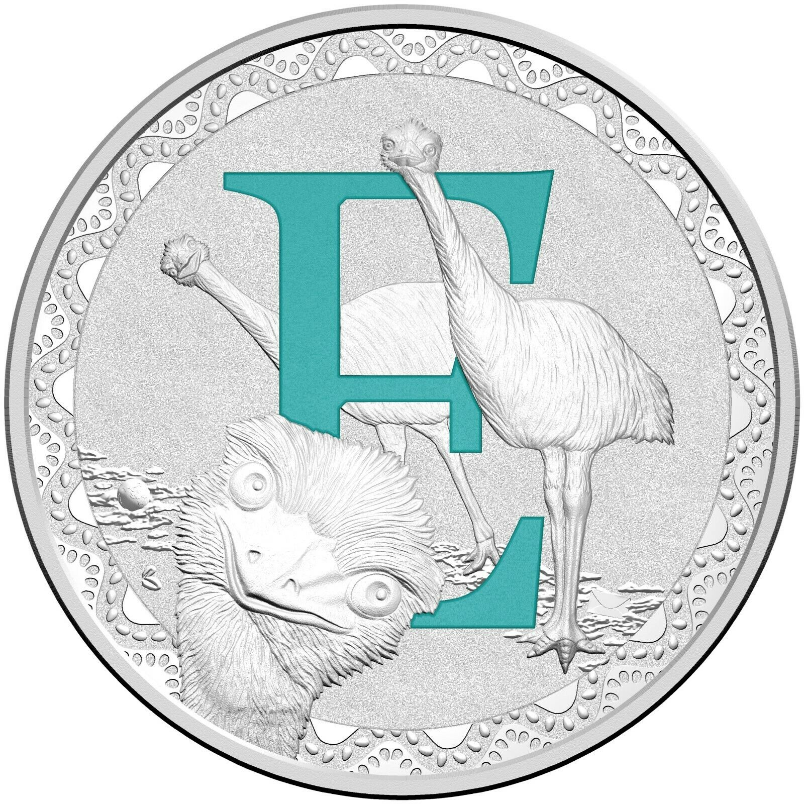 Описание: Монета с буквой E изображает энергичного и любознательного эму, игриво взаимодействующего с буквой E.