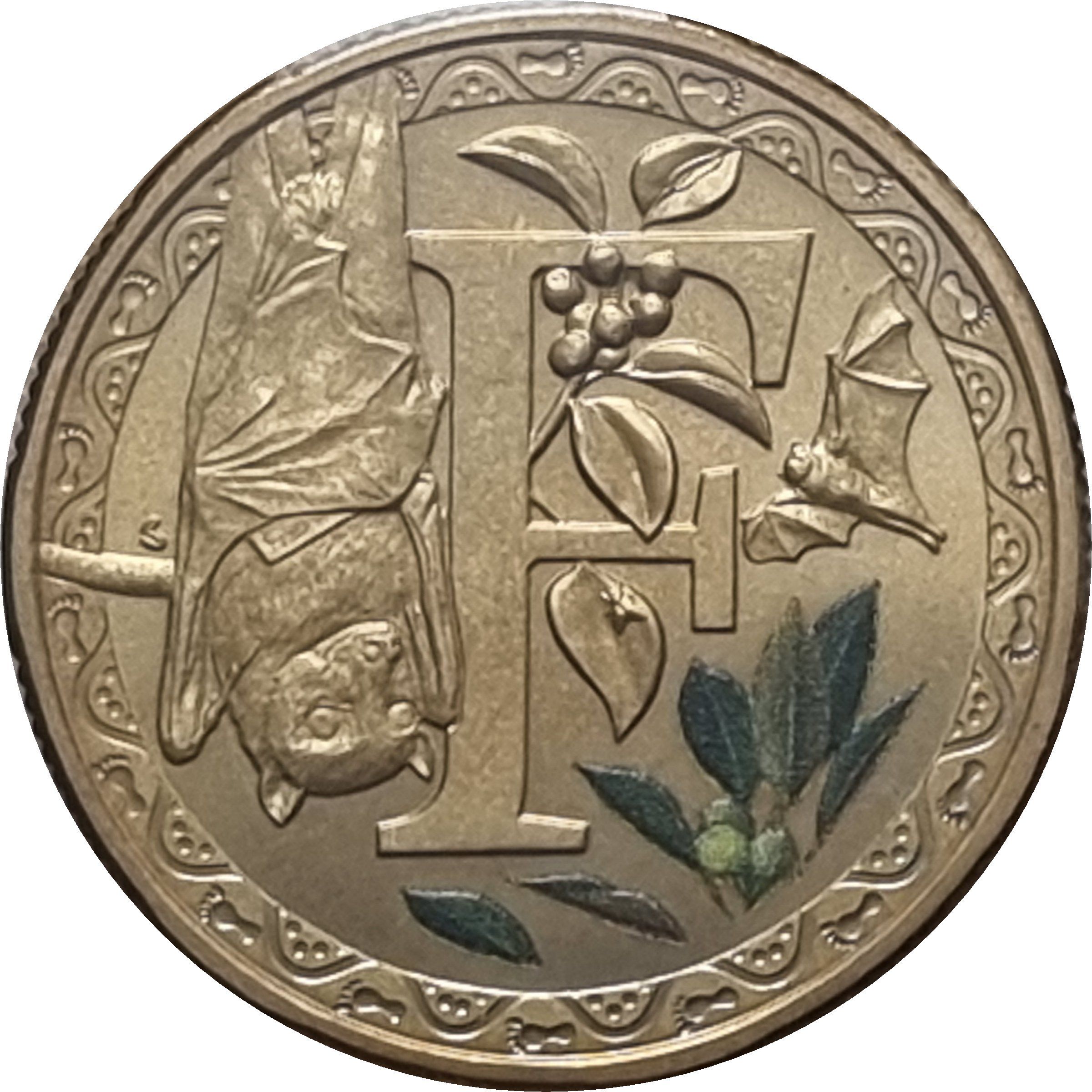 Описание: На монете с буквой F изображена самая большая летучая мышь Австралии, сероголовая летучая лисица, в ее естественной среде обитания, игриво взаимодействующая с буквой F.