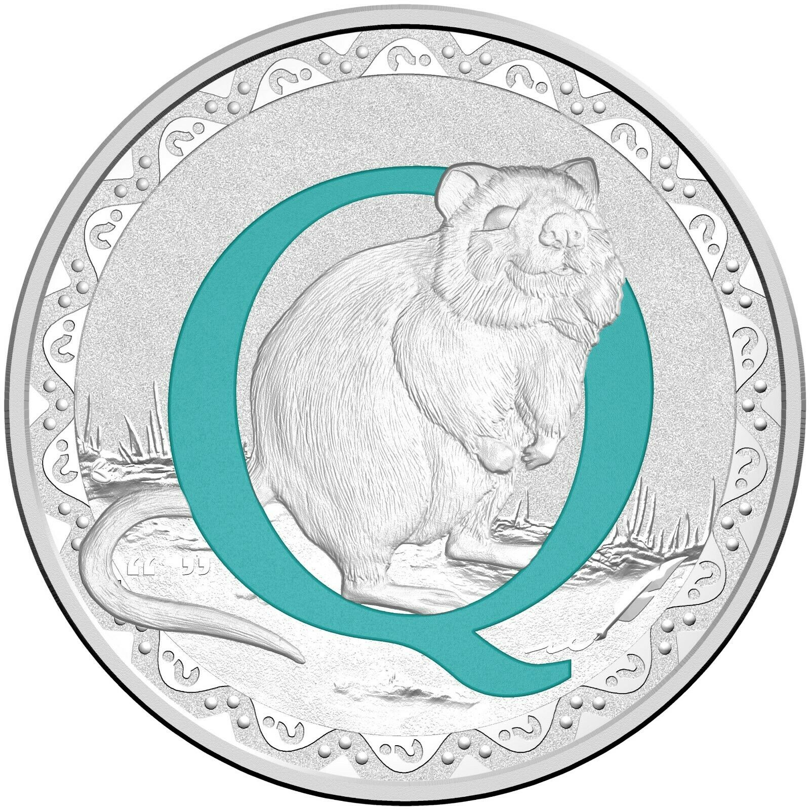 Описание: На монете с буквой Q изображен причудливый и необычный квокка, игриво взаимодействующий с буквой Q.