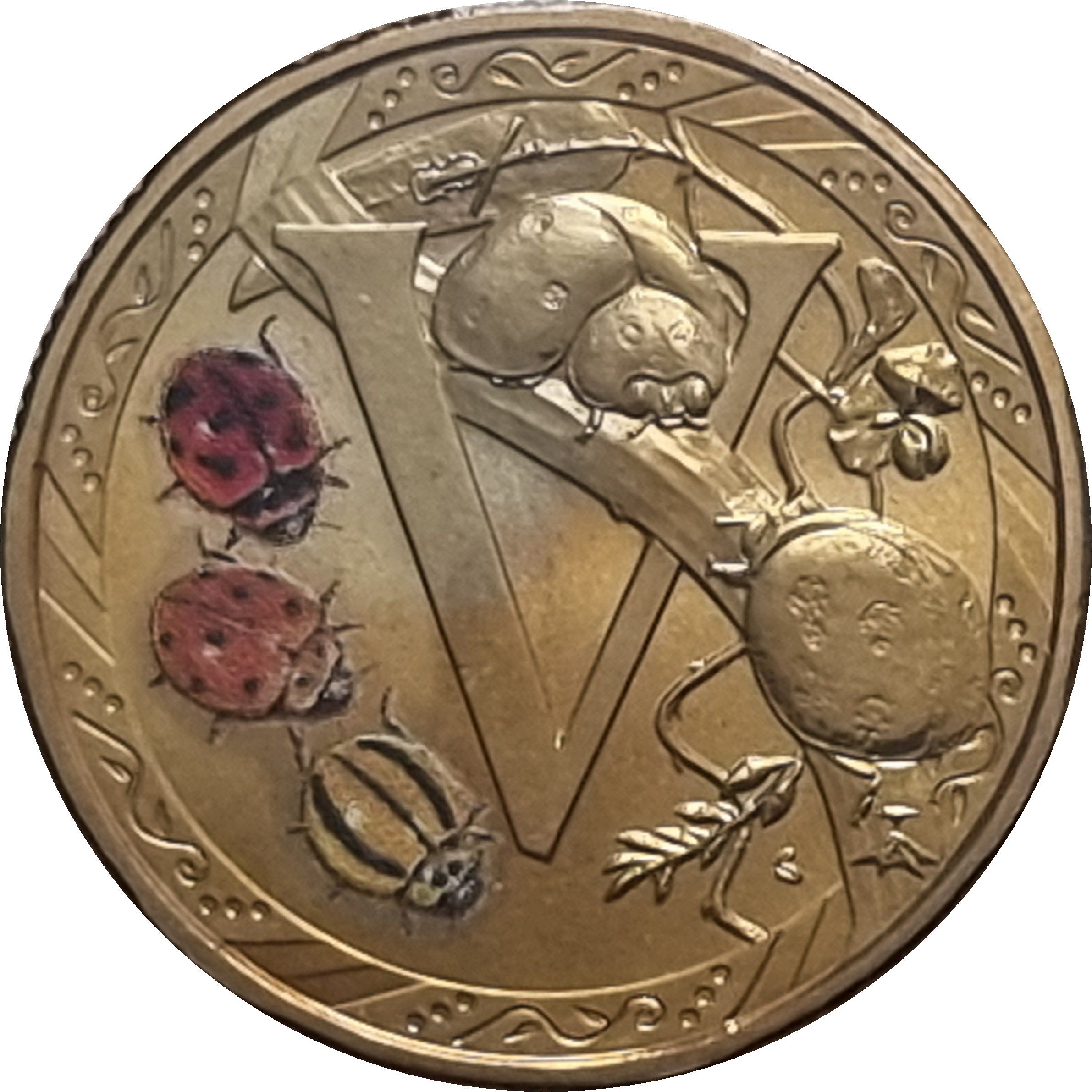 Описание: Монета с буквой V изображает яркую переменчивую божью коровку, игриво взаимодействующую с буквой V.