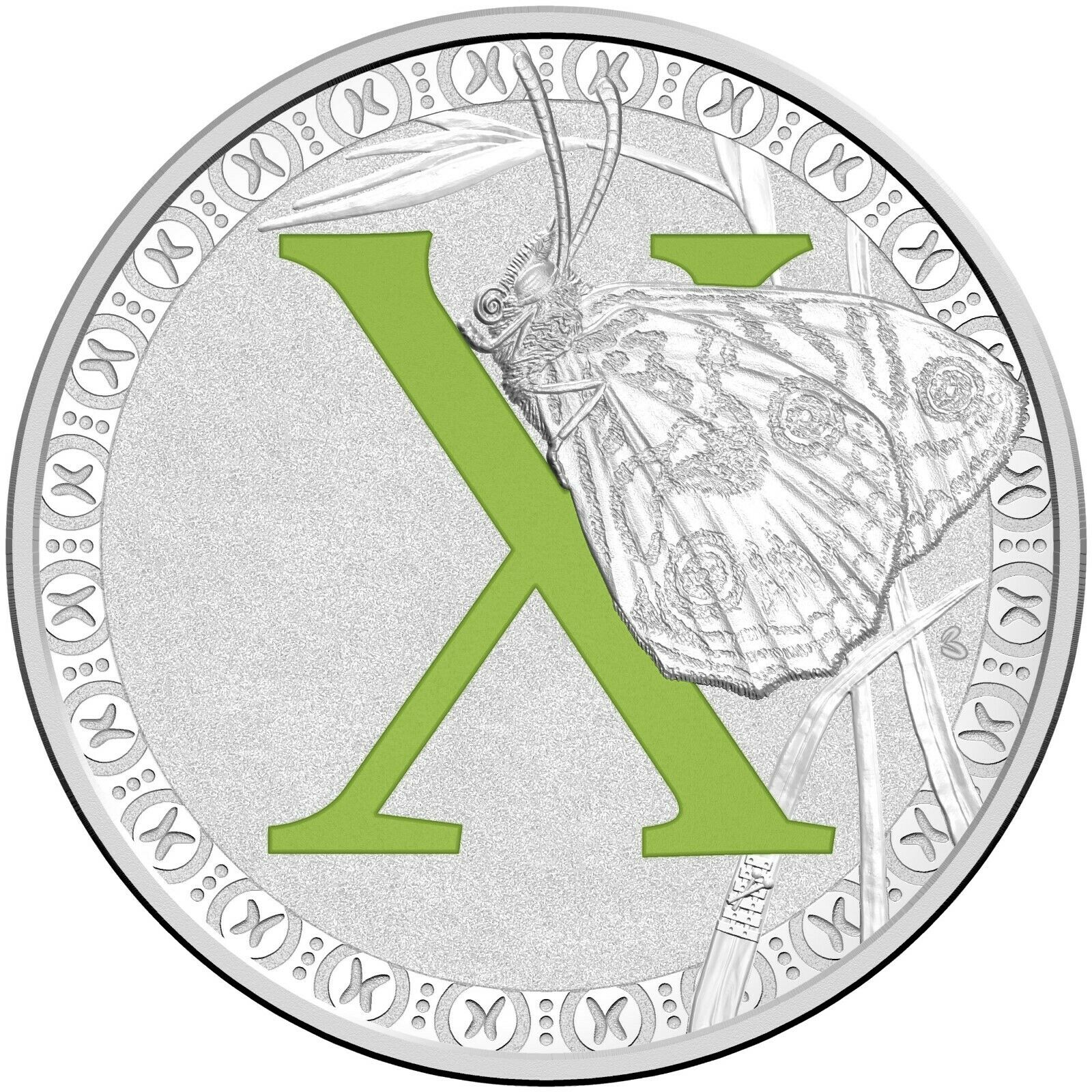 Описание: Монета с буквой X изображает прекрасную и образцовую бабочку Xenica, игриво взаимодействующую с буквой X.