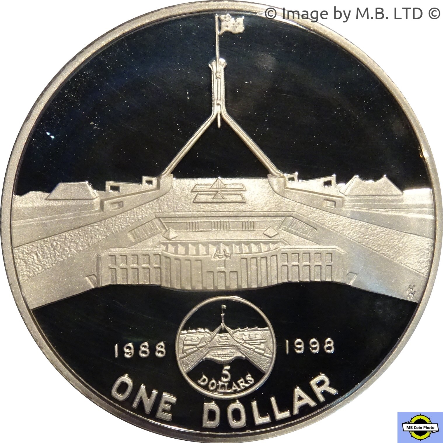 Описание: Вигляд спереду Нової будівлі парламенту на дизайні монети номіналом 5 доларів 1988 року.