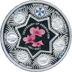 Описание: На внешнем кольце изображены эмблемы шести штатов и Северной территории, а также Квинсленд в цвете. На внутреннем кольце изображена цветная эмблема Квинсленда — орхидея Куктаун.