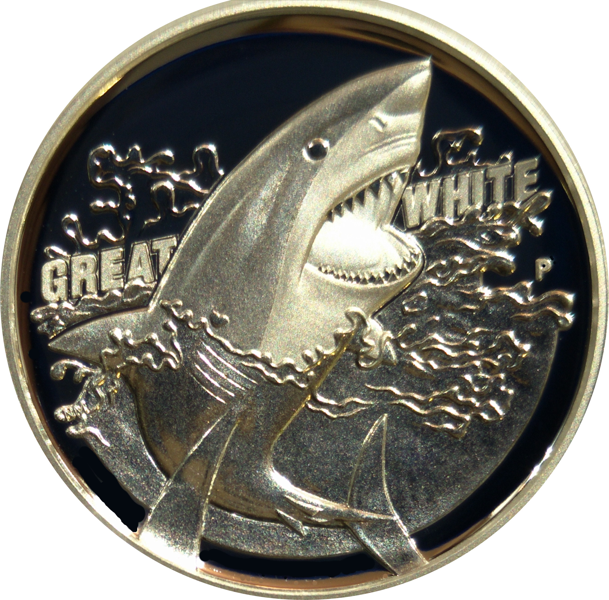 Описание: На реверсе монеты изображена большая белая акула с открытой пастью, обнажающей острые зубы. Дизайн включает надпись GREAT WHITE и клеймо монетного двора Перта «P». Рельефный реверс и аверс монеты отчеканены на вогнутых поверхностях, чтобы обеспечить оптимальный поток металла при ударе штампа.