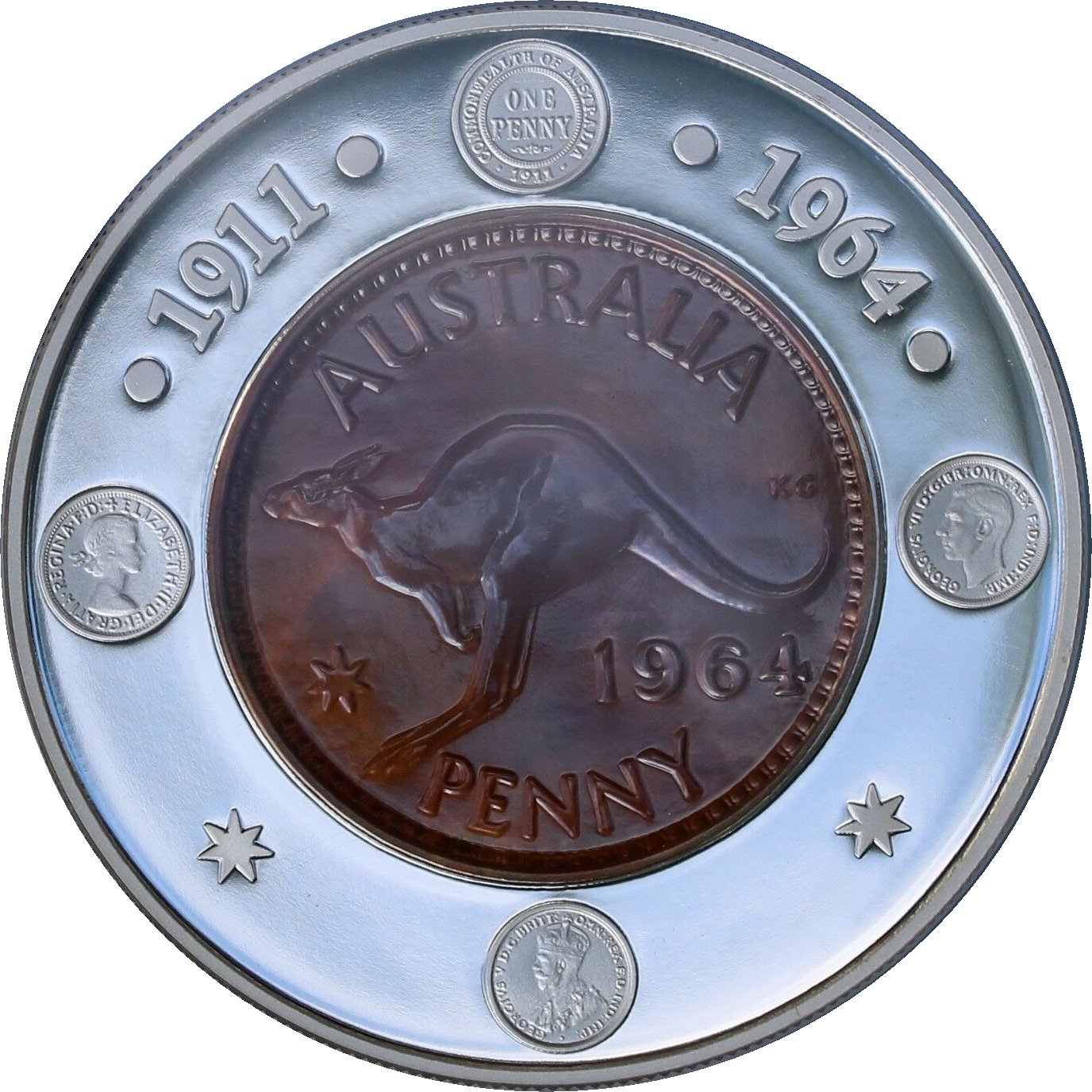 Описание: Реверс австралийской монеты 1964 года, расположенный в центре серебряного внешнего кольца. На внешнем кольце изображены реверс и аверс монет, выпущенных в период с 1911 по 1964 год.