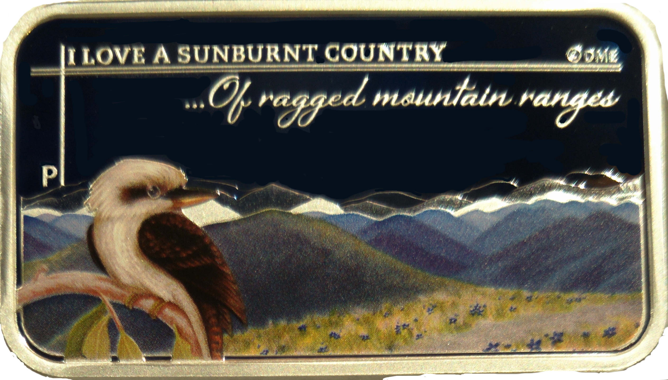 Описание: Красочное изображение кукабарры, сидящей на ветке эвкалипта, на фоне горных хребтов. Дизайн включает надпись «I LOVE A SUNBURNT COUNTRY...Of rugged mountain ranges» (Я люблю зажаренную солнцем страну... С ее суровыми горными хребтами) и клеймо монетного двора Перта «P».