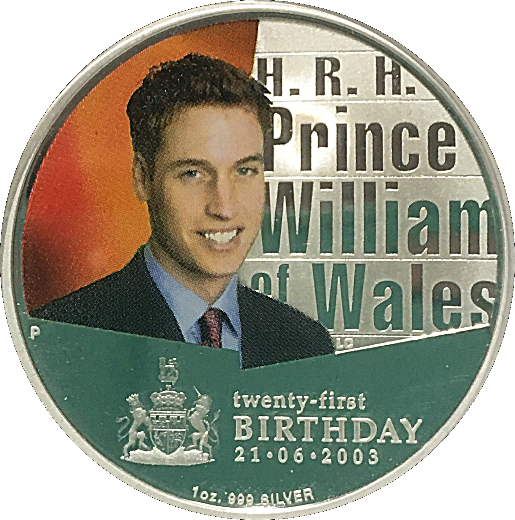 Описание: Кольоровий портрет принца Вільяма з його ім'ям та титулом праворуч від портрета. Під портретом зображено його герб у матовому рельєфі з маркуванням монетного двору Перта «P».