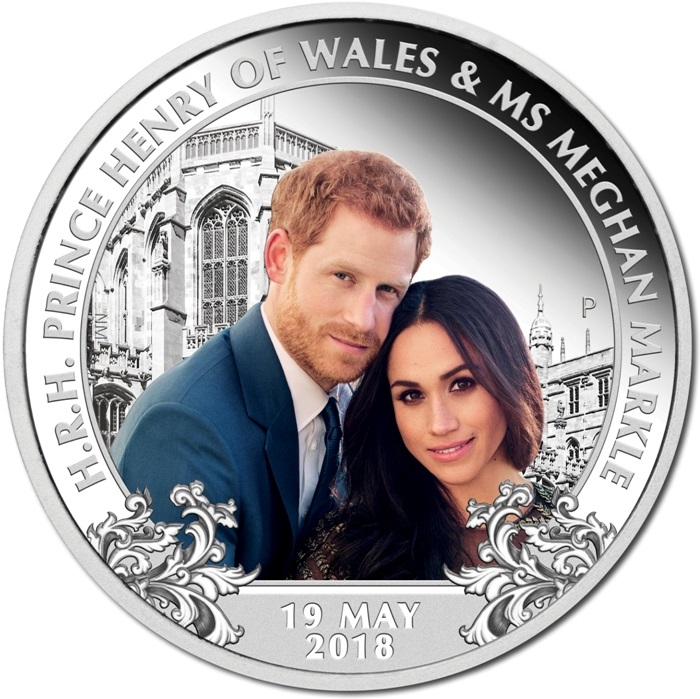 Описание: Официальное цветное изображение счастливой пары, опубликованное после их помолвки. На заднем плане изображен Виндзорский замок, где они поженились в ходе исторической церемонии, за которой наблюдали около 29 миллионов человек по всему миру. На монете также имеются надписи «Его Королевское Высочество принц Уэльский Генри и мисс Меган Маркл» и «19 мая 2018 года», дата свадьбы.