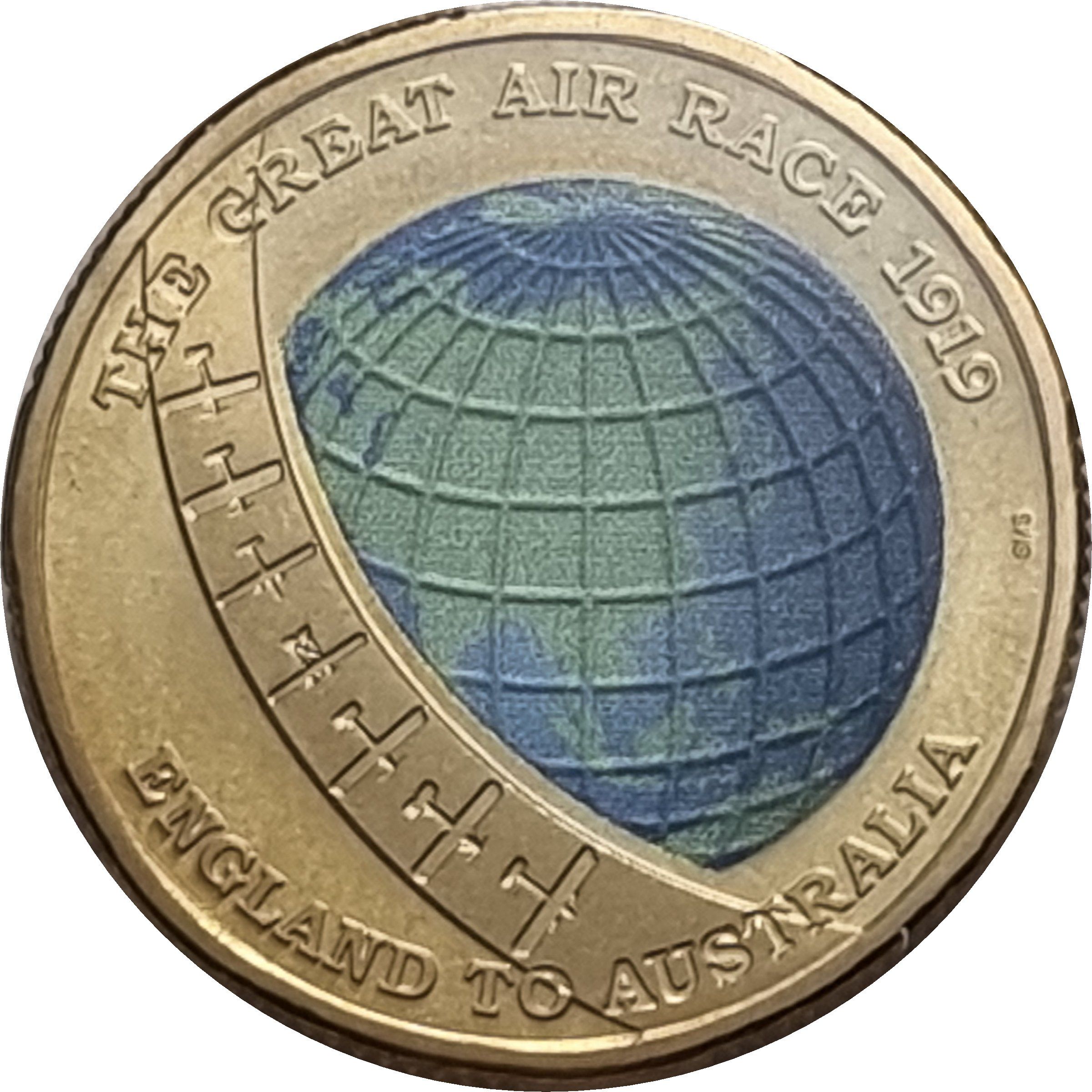 Описание: Глобус мира, на котором показан маршрут Великой воздушной гонки между Англией и Австралией. Перед глобусом изображена лента с семью различными самолетами.