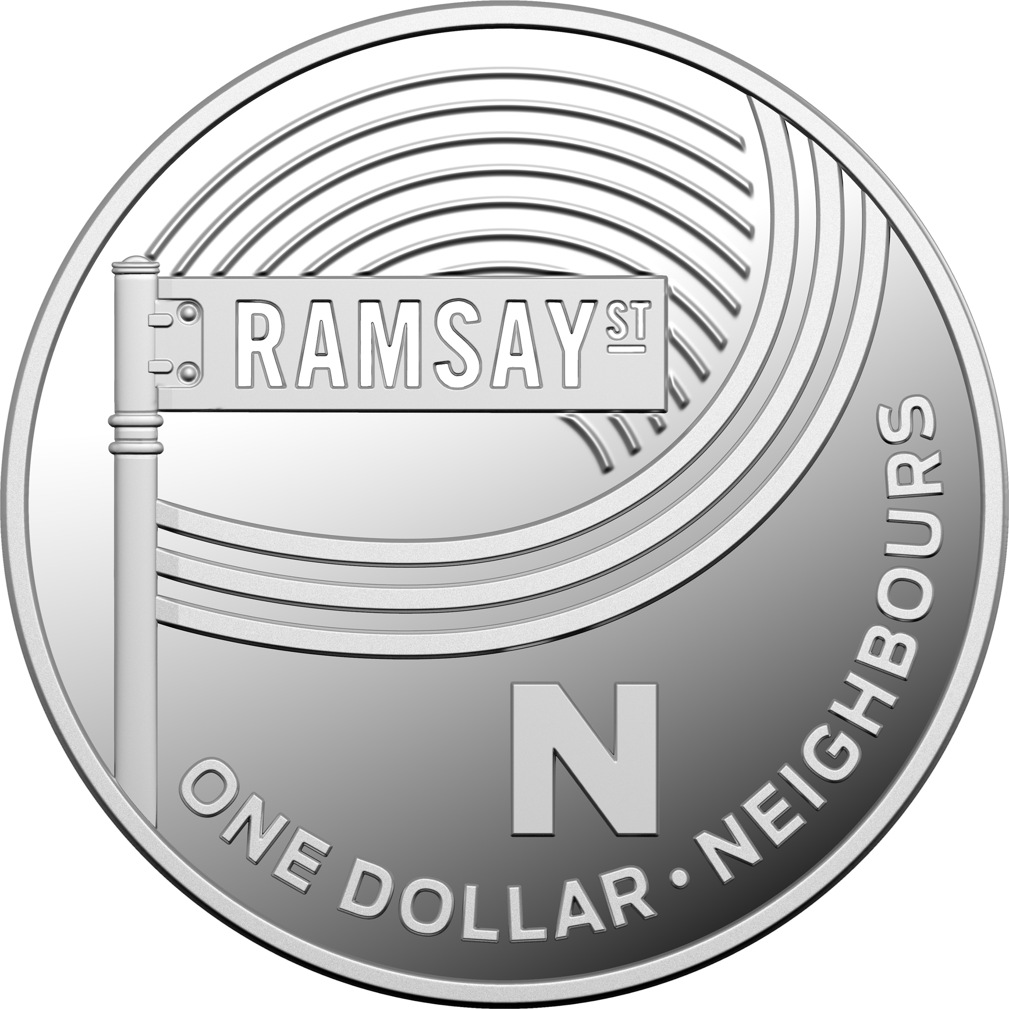 Описание: Изображение дорожного знака «Ramsay Street» из телесериала «Соседи». Буква N внизу.