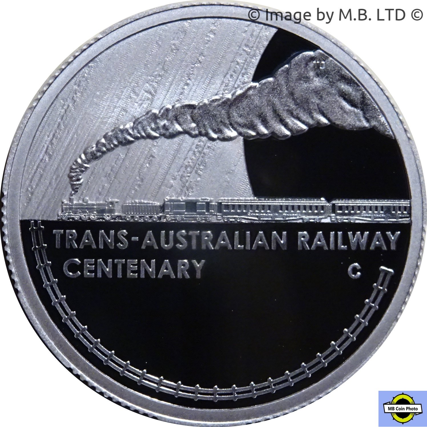 Описание: На монете, посвященной столетию Трансавстралийской железной дороги, изображен стилизованный локомотив класса G и сопутствующие вагоны, которые использовались в первоначальном путешествии сто лет назад. Они изображены движущимися справа налево с большим столбом дыма. Железнодорожные пути в виде полукруга расположены в нижней половине монеты.