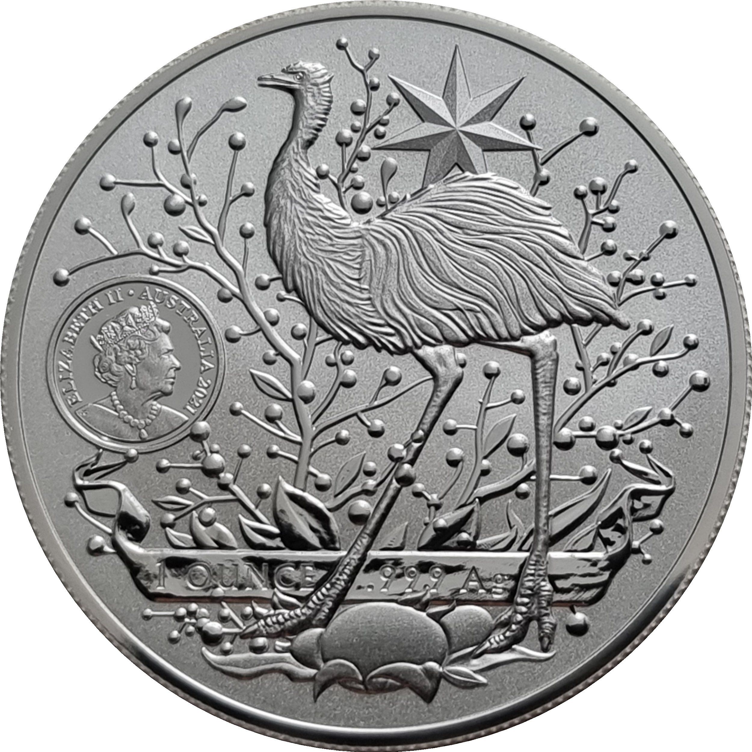 Описание: Фауна с правой стороны герба Австралии, эму среди австралийской флоры. Семьконечная звезда вверху, кладка яиц эму внизу. Слева миниатюрная монета, похожая на изображение обычного аверса с шестым портретом королевы Елизаветы II в короне, обращенной вправо, в диадеме Георга IV и викторианском коронационном ожерелье.