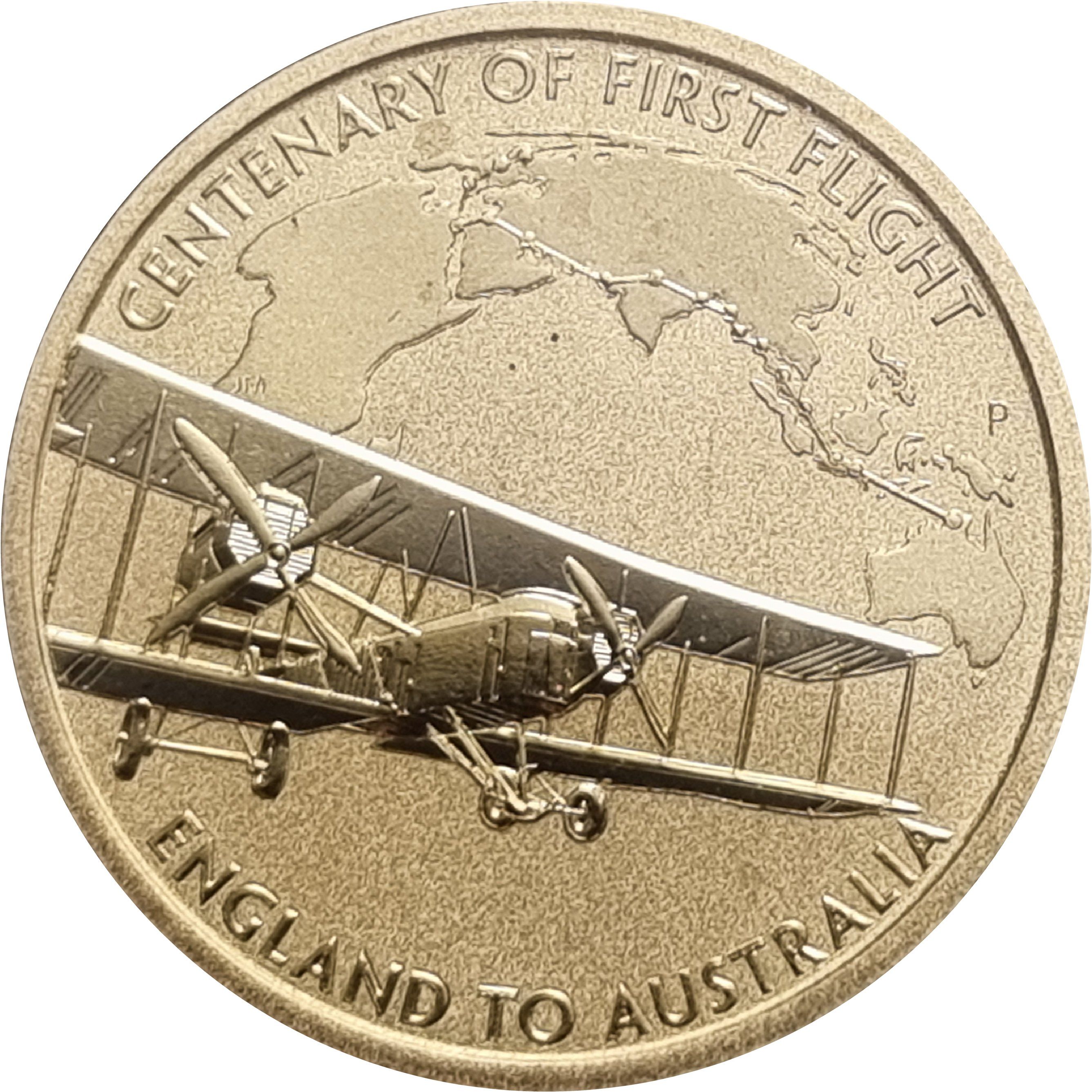 Описание: На монете изображен самолет Vickers, совершивший мучительную экспедицию, и карта маршрута полета.
