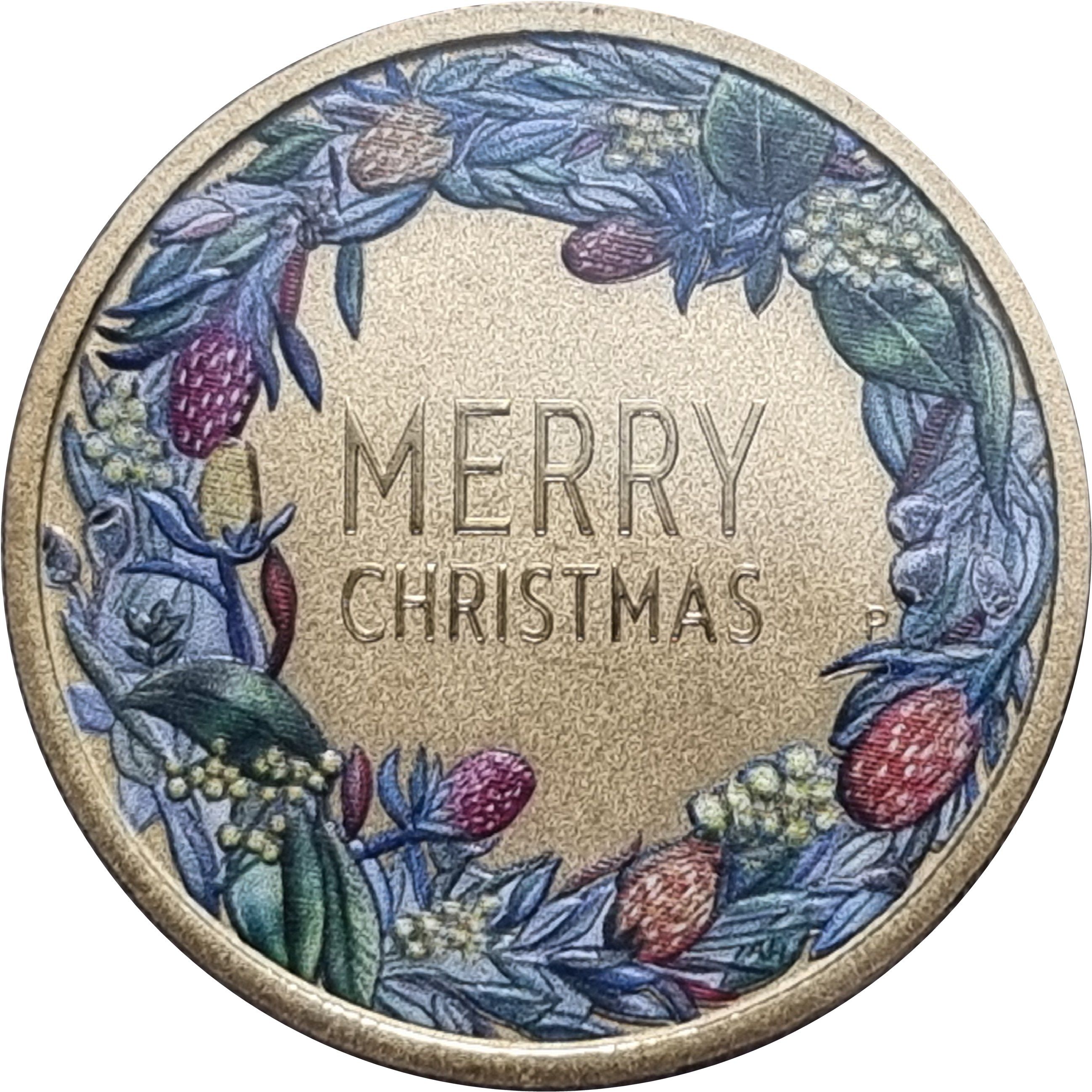 Описание: Декоративный рождественский венок из австралийских цветов, включая бутылочную щетку, варатаху и лапу кенгуру, в полном цвете окружает текст в центре.