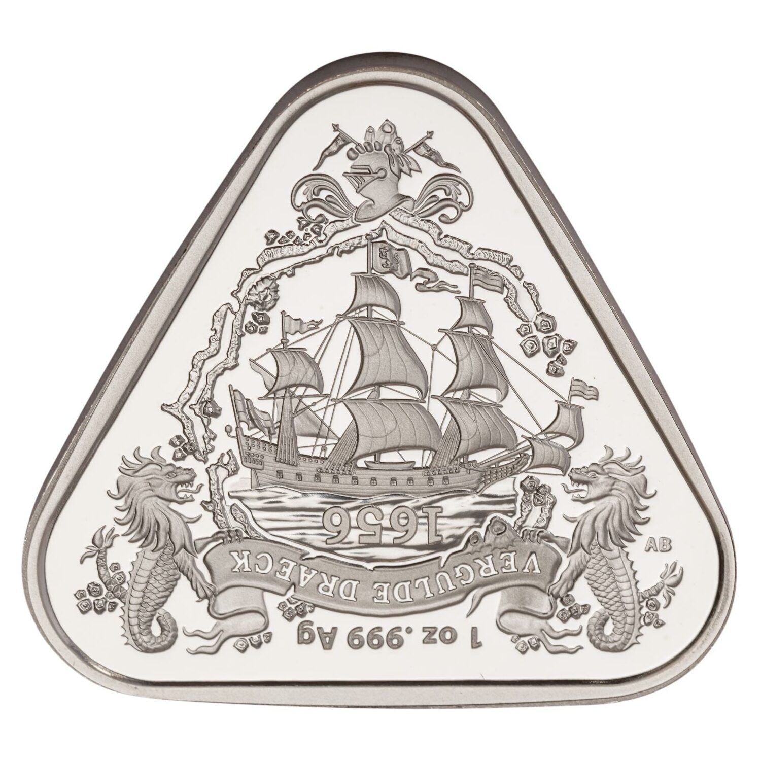 Описание: Изображает корабль Vergulde Draeck, окруженный декоративными морскими орнаментами. Текст перевернут.