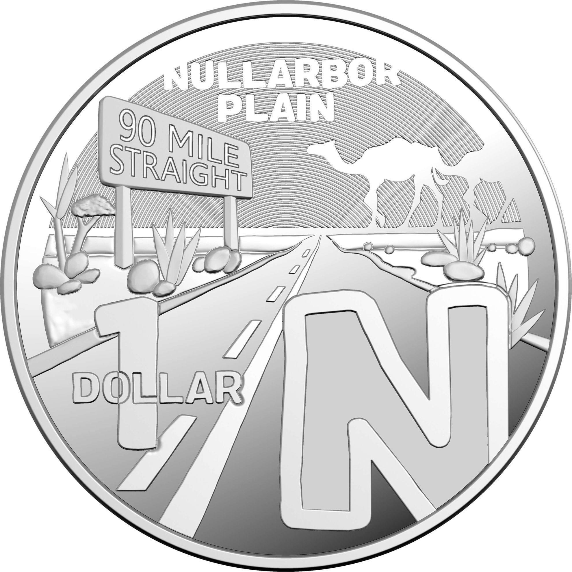 Описание: Вид на дорогу, исчезающую на равнине Наллабор, с двумя пересекающими ее верблюдами.