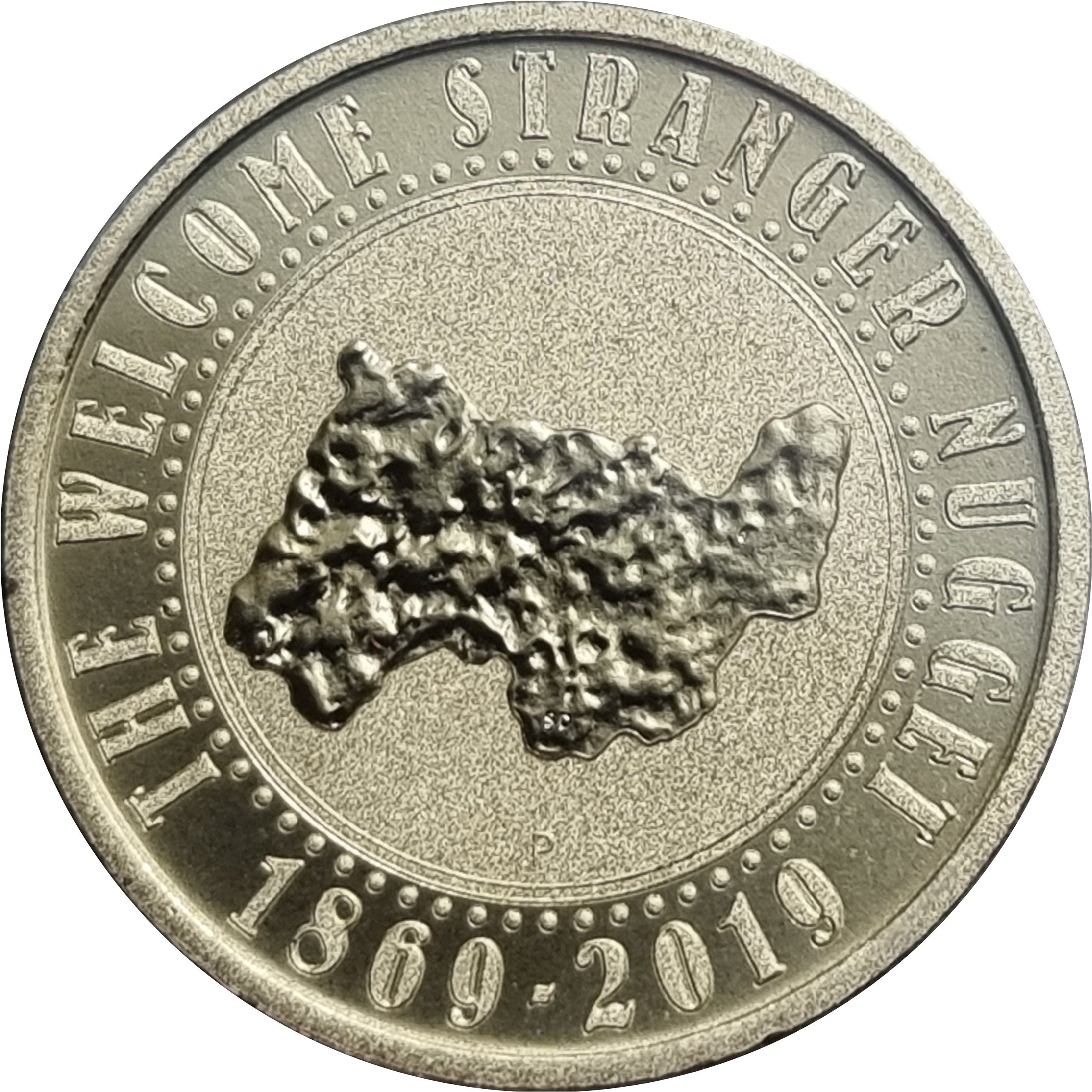 Описание: На реверсе монеты изображен самородок Welcome Stranger с надписью «THE WELCOME STRANGER NUGGET 1869 - 2019», а также клеймо монетного двора Перта «P».