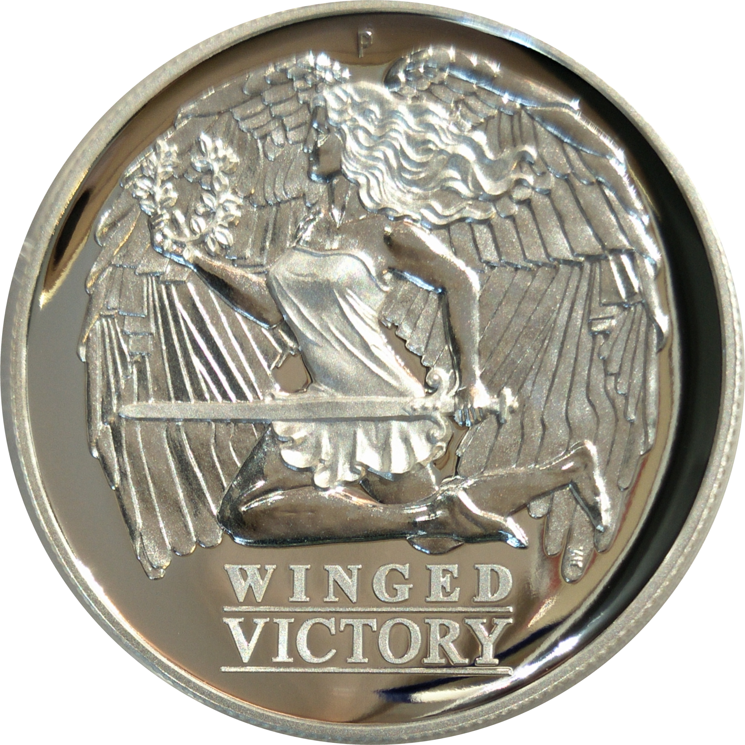 Описание: На рельефном реверсе монеты изображена Ника в стиле ар-деко. Мускулистая фигура Ники, воздающая честь невидимому герою с лавровым венком в правой руке, окружена красивым симметричным изображением крыльев с перьями.