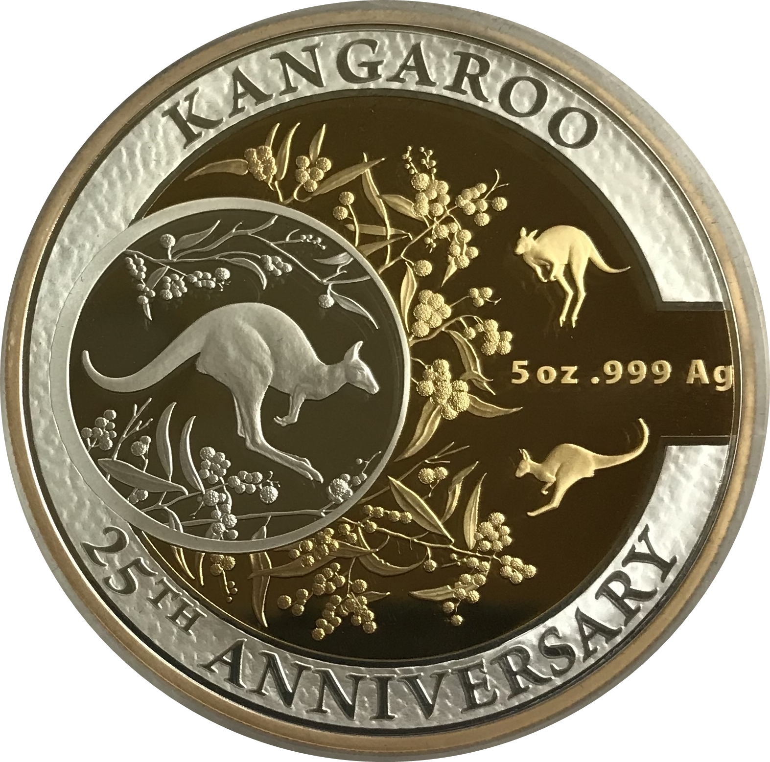 Описание: На монете изображены кенгуру из ранних дизайнов серии. Дизайн также отдает дань уважения культовому прыгающему кенгуру, изображенному на реверсе австралийского пенни 1937 года. На монете также изображен акация. Монета частично покрыта позолотой.