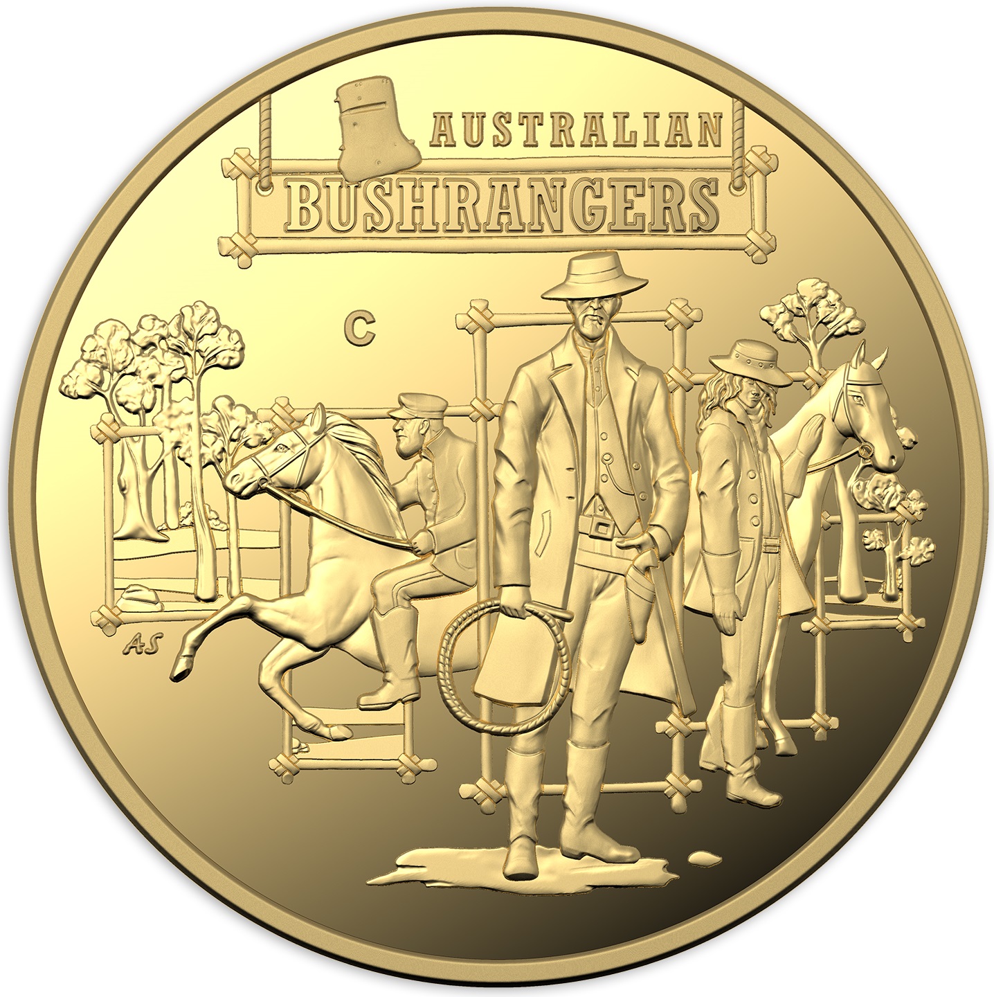 Описание: Изображение двух бандитов, стоящих с лошадью в центре и справа. Полицейский на лошади слева. Металлический шлем Неда Келли вверху. Деревья на заднем плане.