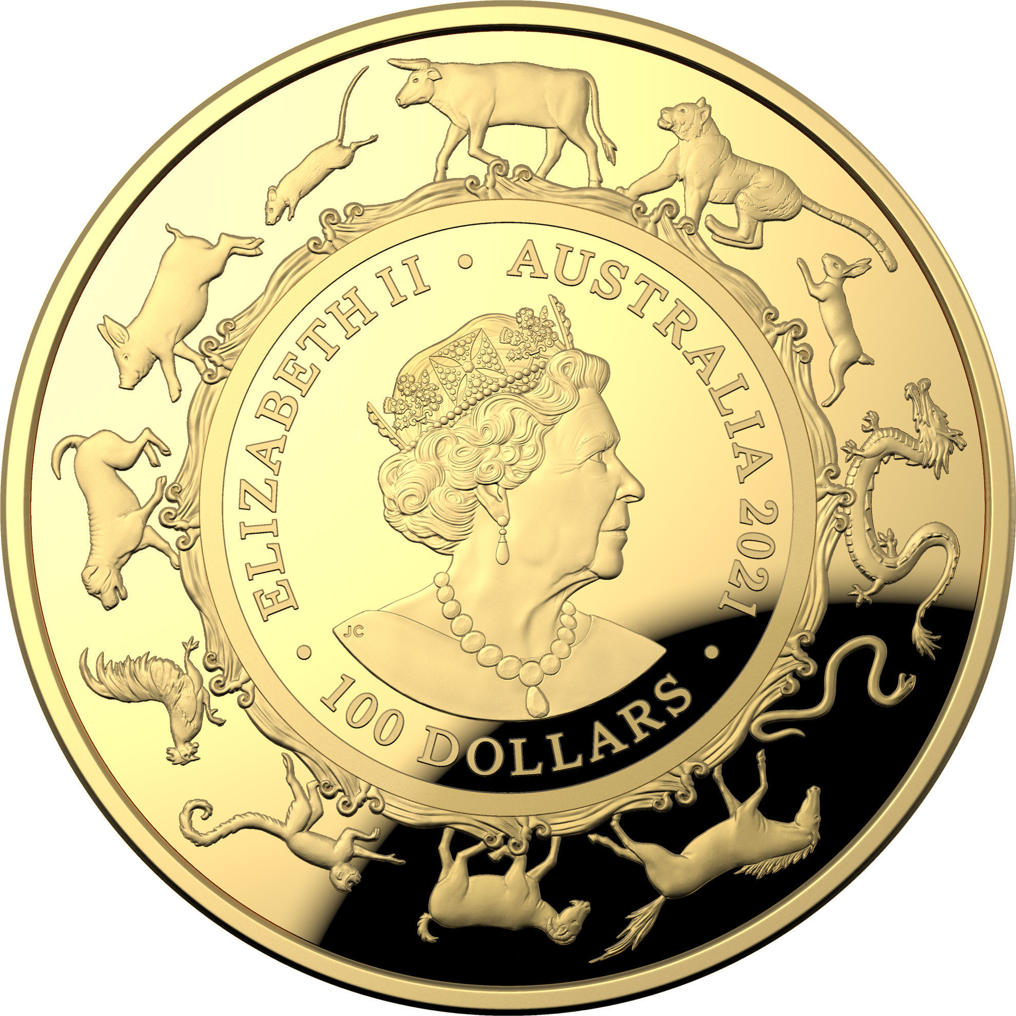 100 долларов — Елизавета II (6-й портрет — год Быка; куполообразная — золотая пробная монета)