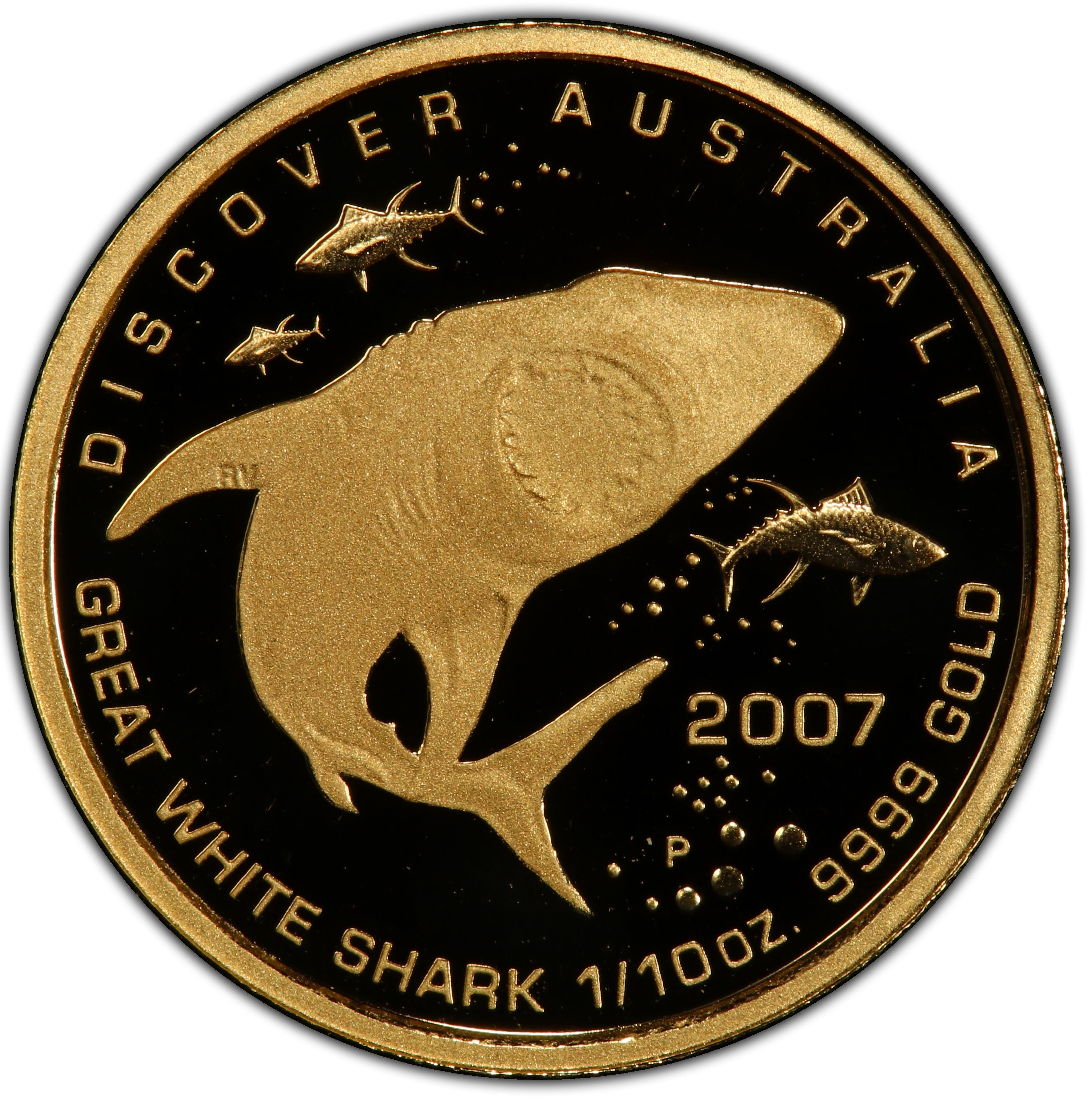 15 долларов — Елизавета II (4-й портрет — Большая белая акула; золотая пробная монета)