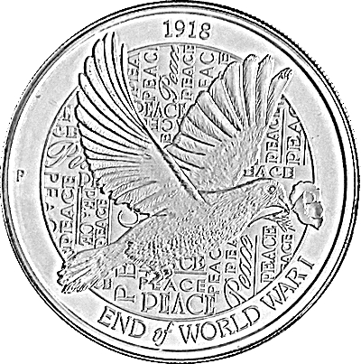 Описание: Летящий голубь с маком в клюве перед словом «мир» в нескольких шрифтах и годом выше.