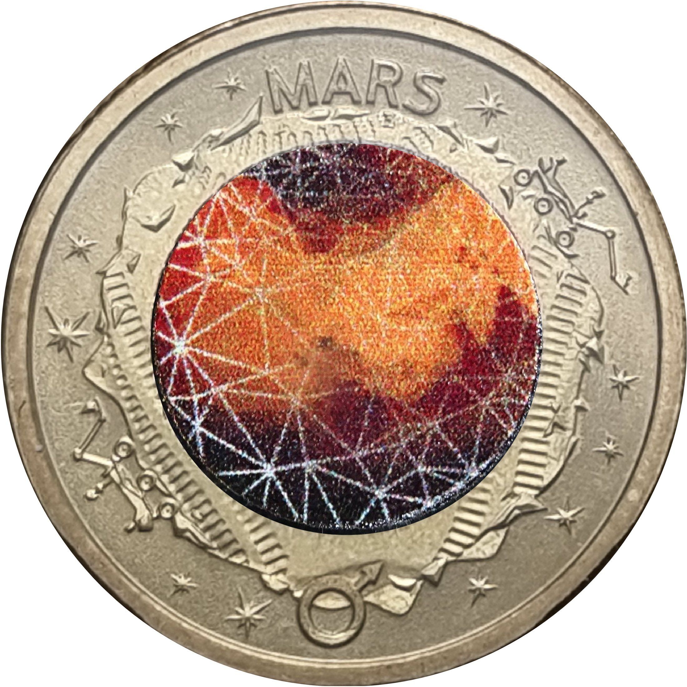 Описание: Планета Марс, напечатанная тампопечатью оранжево-красным цветом. В окружении скалистого ландшафта с двумя марсоходами и звездами. Символ планеты Марс внизу.