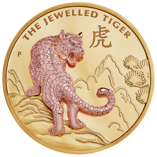 Описание: Тело тигра изготовлено из 18-каратного розового золота и тщательно инкрустировано 328 великолепными розовыми бриллиантами Argyle. В каждом глазу сияет изумруд Muzo.