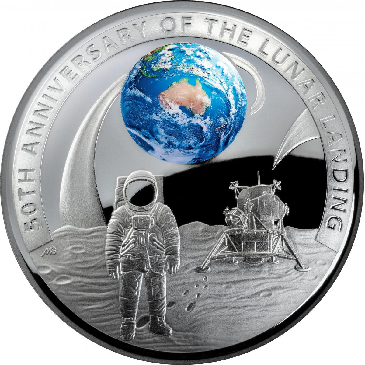 Описание: Один из астронавтов «Аполло-11» стоит на поверхности Луны, а на заднем плане виден лунный модуль «Игл». Земля, видимая в цвете, в небе за астронавтом, показывает Австралию, расположенную прямо напротив Луны. На небе изображено долгое путешествие экипажа «Аполло-11» от Земли до Луны.
