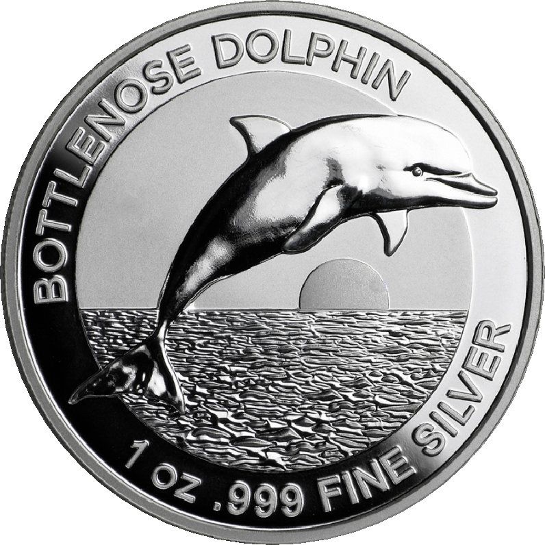 Описание: Дельфин-афалина, выпрыгивающий из океана на фоне солнца. Вес и проба указаны ниже.