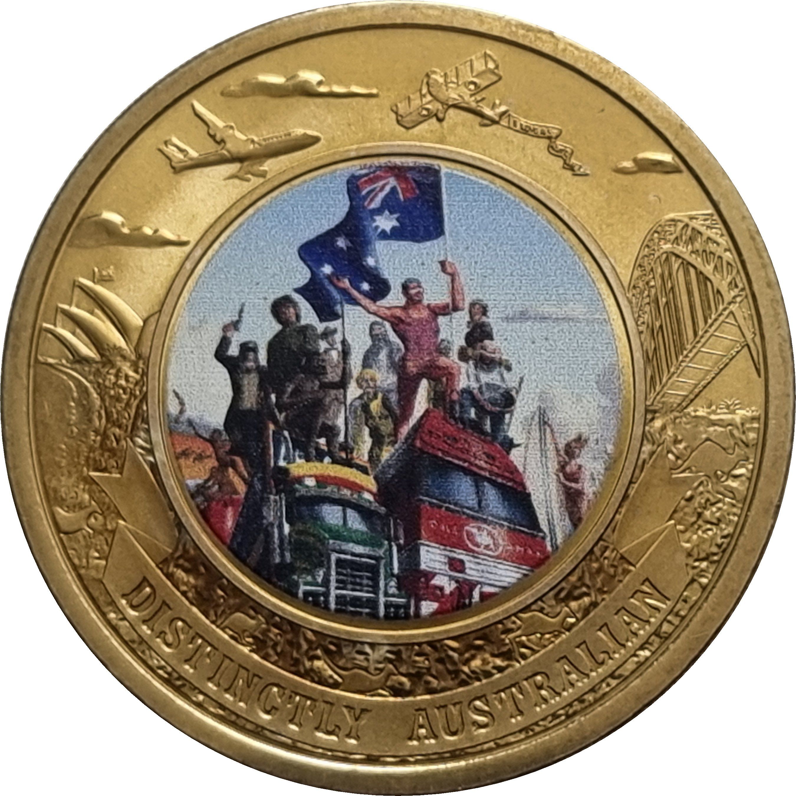 Описание: На внутреннем круге нанесена печать с изображением известных австралийских символов, над которыми расположен австралийский флаг. На внешнем кольце нанесены дополнительные штампованные австралийские символы, окружающие внутренний круг.