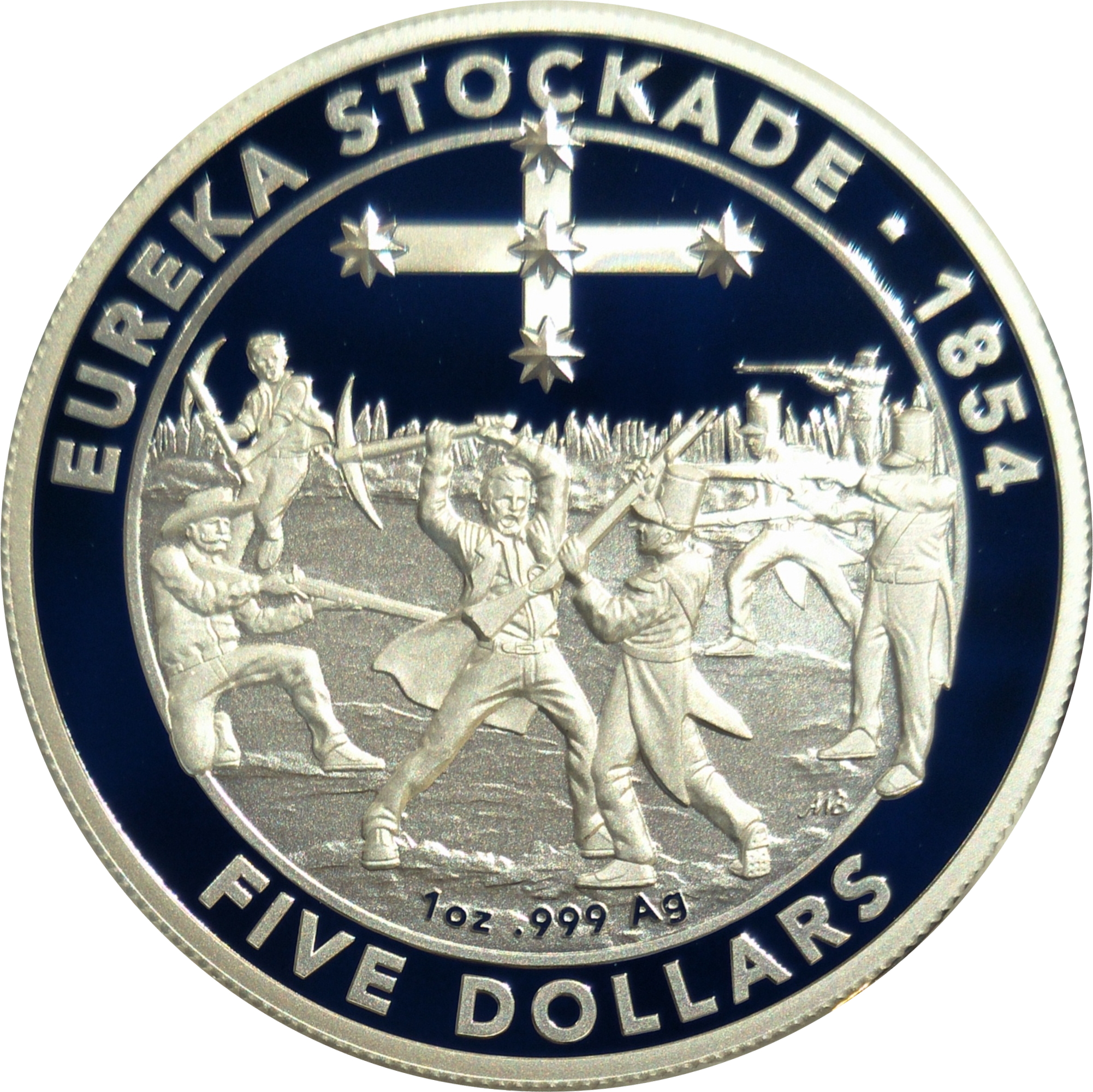 Описание: Стилізований Південний Хрест над зображенням бою між шахтарями та солдатами в Еурека-Стокейд.