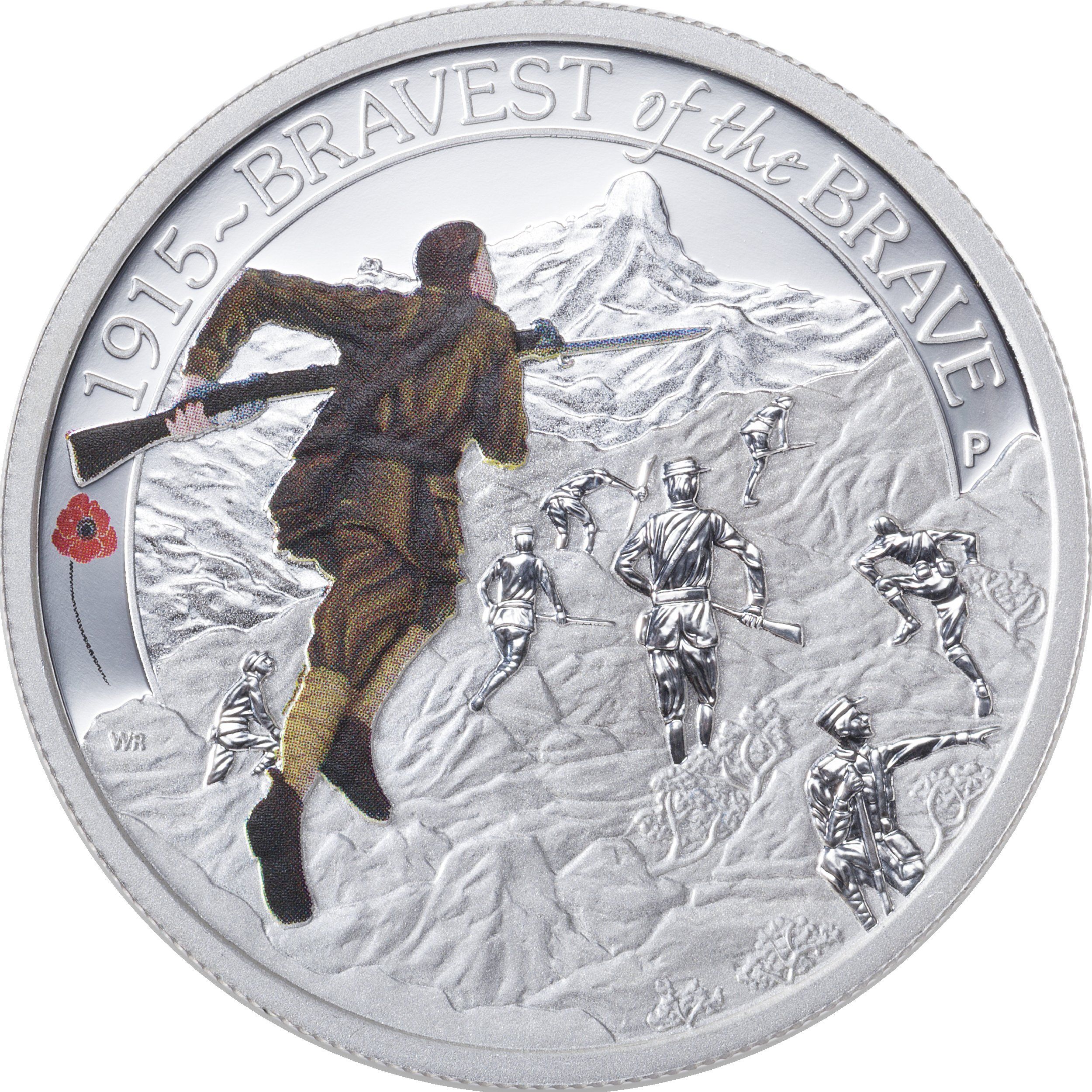 Описание: Изображение солдат Анзак, сражающихся за восхождение на утесы над бухтой Анзак. Дизайн включает одного солдата в цвете на переднем плане, надпись «1915 — Bravest of the Brave» (1915 — самые храбрые из храбрых), красный мак и традиционный клеймо монетного двора Перта «P».