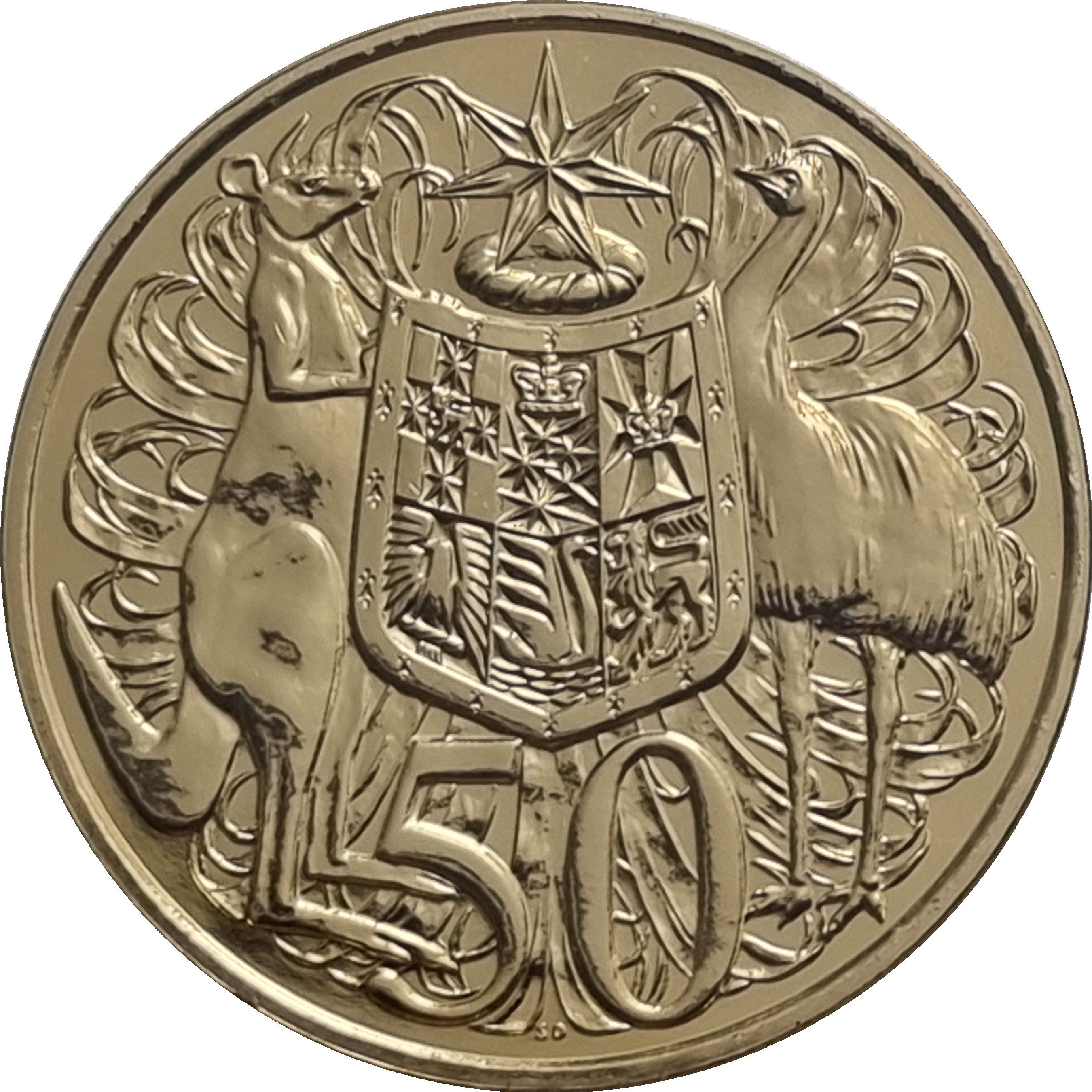 Описание: Герб Австралии (щит несут красный кенгуру (Macropus rufus) и эму (Dromaius novaehollandiae)) и цифра «50».