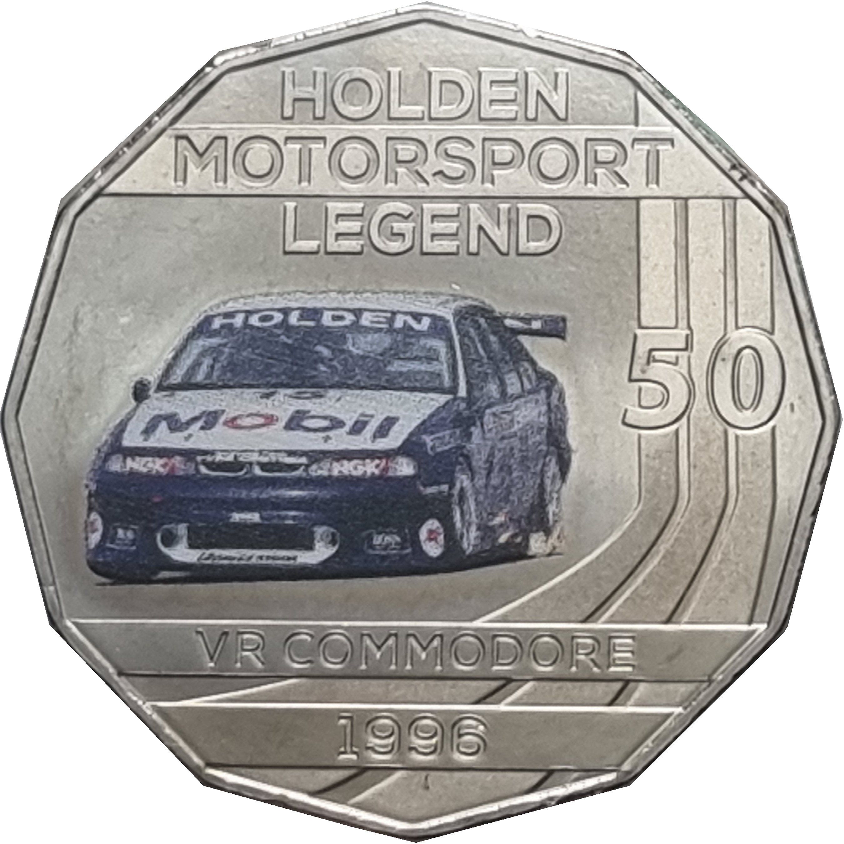Описание: 1996 VR Commodore. Текст сверху и снизу. Номинал справа, наложенный на гоночные линии.