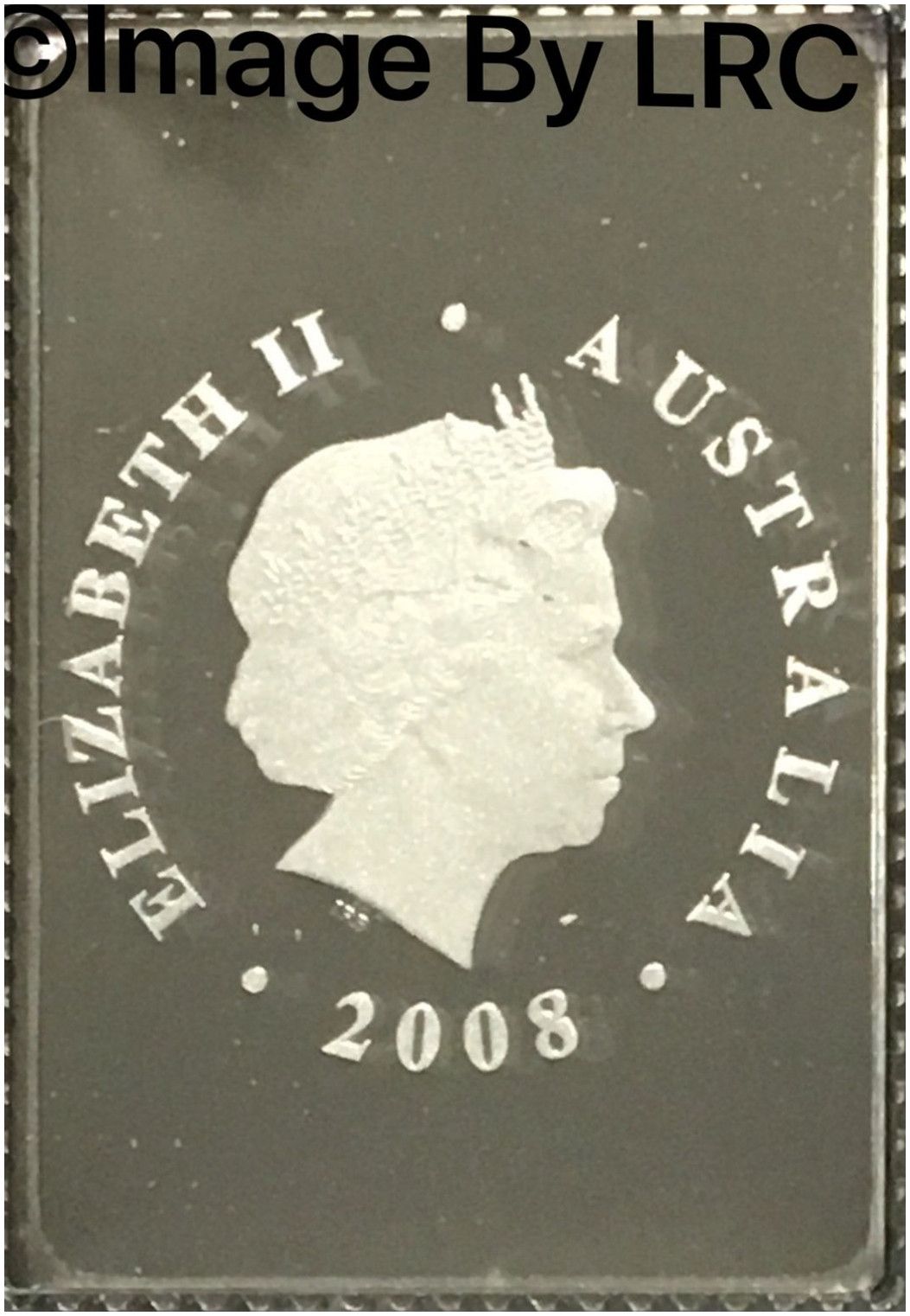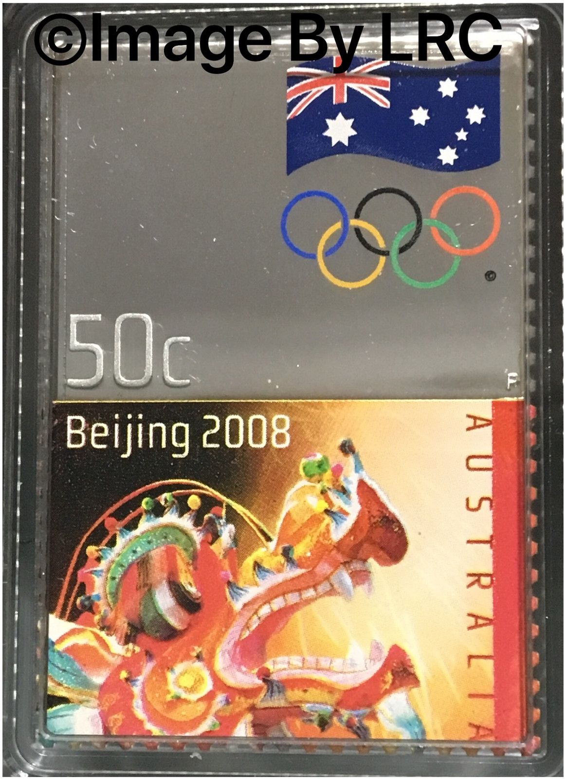Описание: Монета у формі штампа. Верхня половина срібна з кольоровим прапором Австралії над кольоровими олімпійськими кільцями та 50c у нижньому лівому куті. Нижня половина кольорова з китайським драконом, написом AUSTRALIA, написаним вертикально внизу праворуч, з суцільною червоною смугою, та написом Beijing 2008 над драконом.