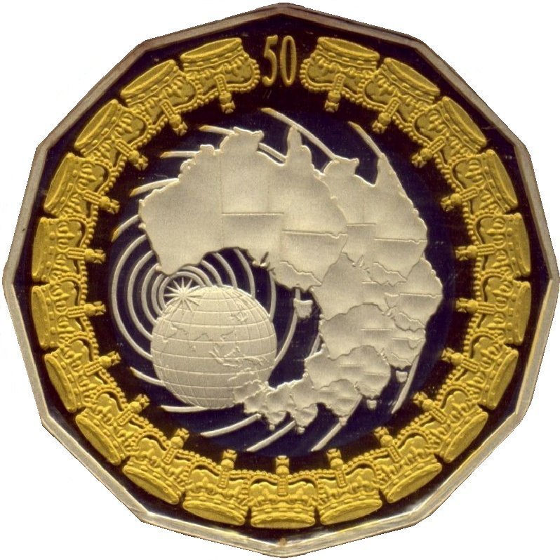Описание: Изображения Австралии, показывающие ее положение на глобусе, окруженном кольцом величественных коронок с маленькой цифрой 50 вверху. Внешнее кольцо коронок покрыто 24-каратным золотом.