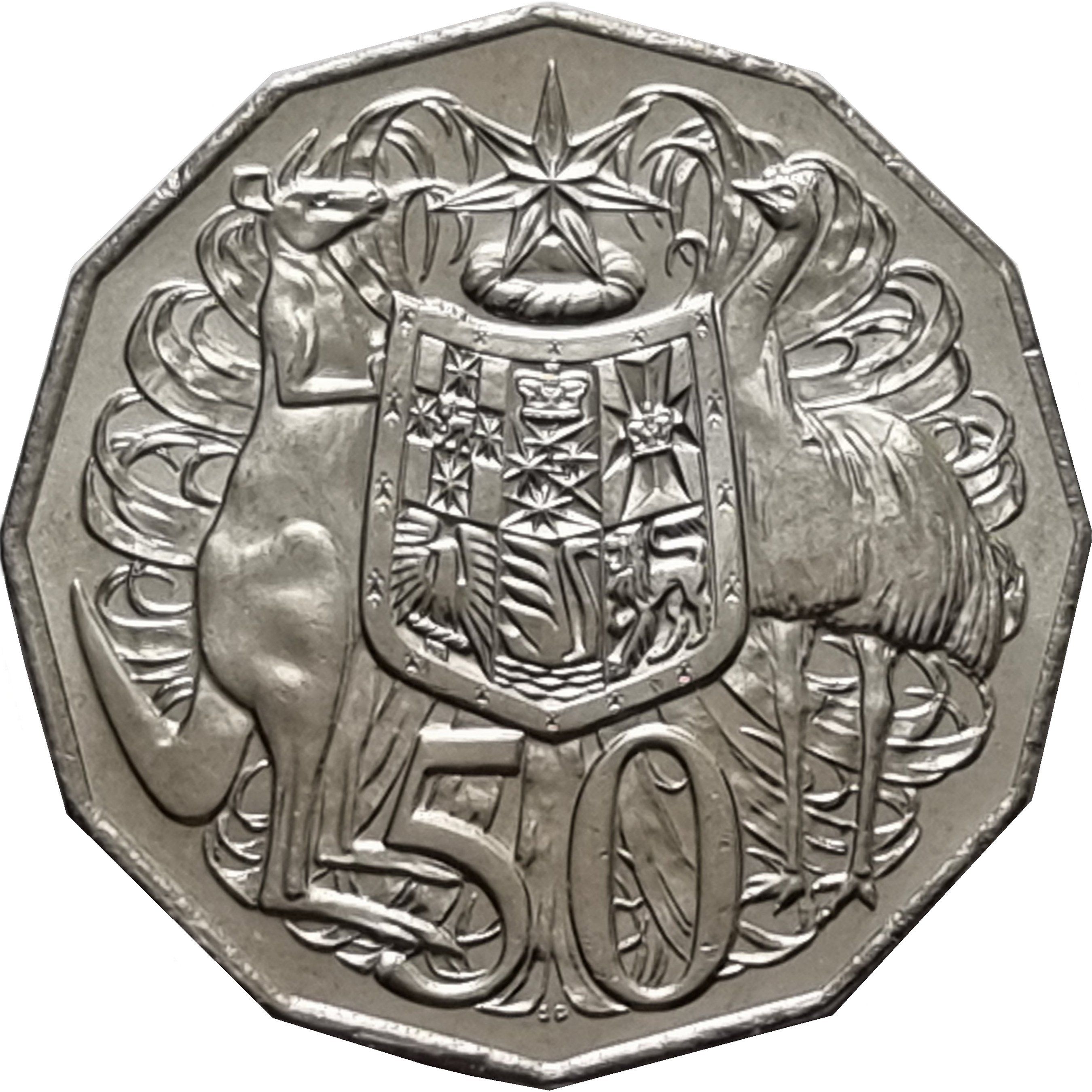 Описание: Герб Австралии (щит несут красный кенгуру (Macropus rufus) и эму (Dromaius novaehollandiae)) и цифра «50».