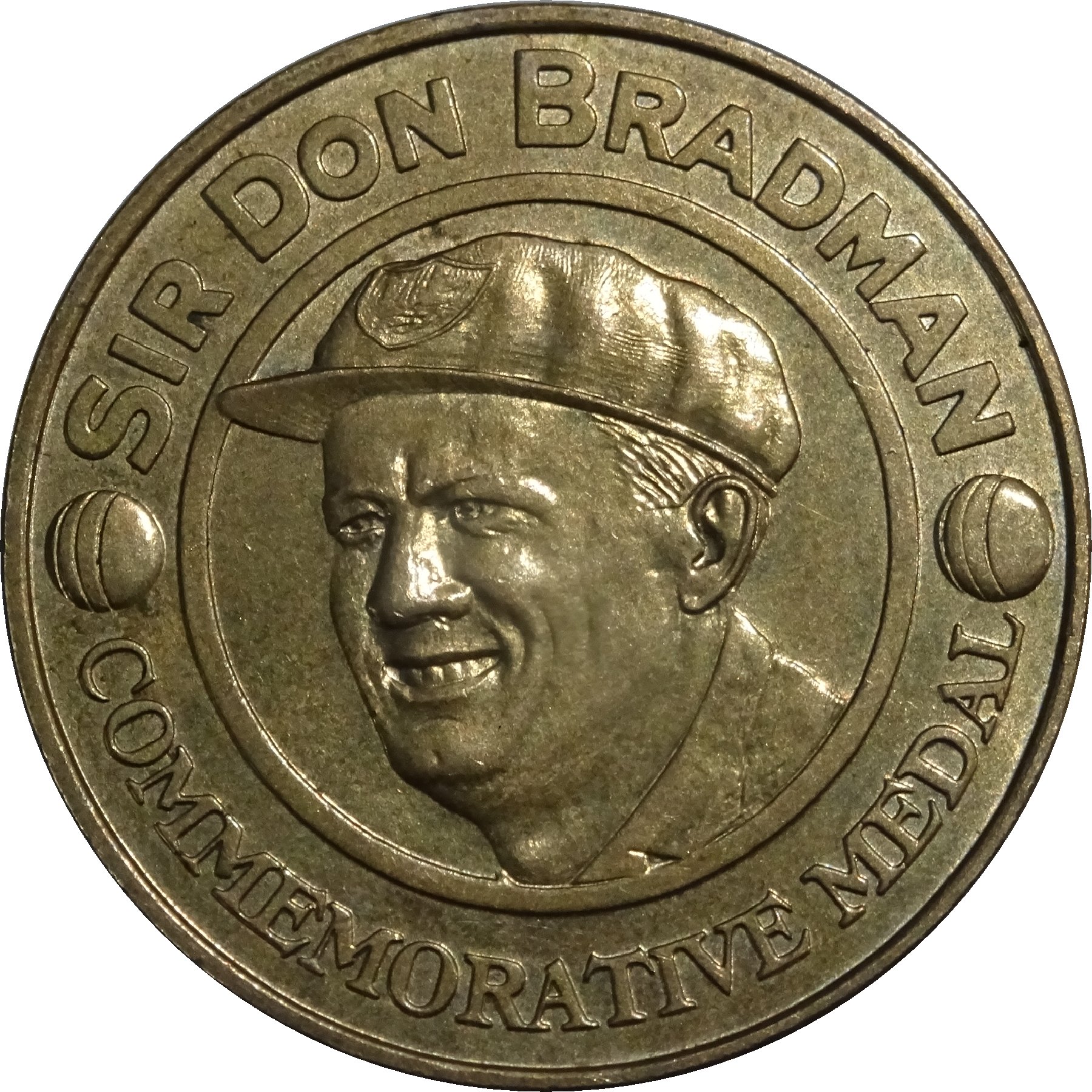 Описание: Голова, звернена вліво, з написом SIR DON BRADMAN та двома крикетними м'ячами. Напис внизу «Commemorative Medal» (Пам'ятна медаль).