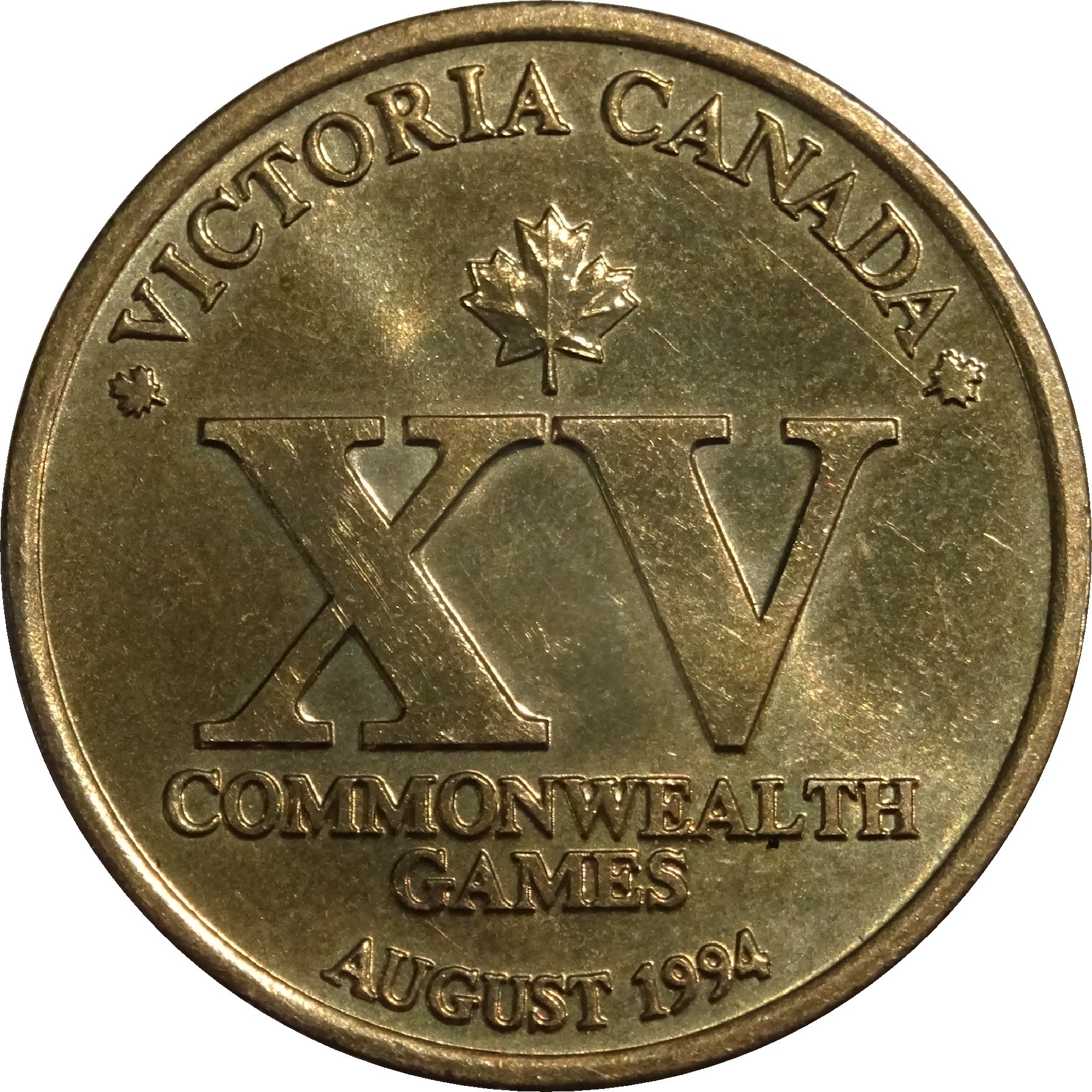 Описание: Кленовий лист з написом «VICTORIA CANADA» у верхній частині. Напис «XV COMMONWEALTH GAMES» у центрі. Напис «AUGUST 1994» у нижній частині.