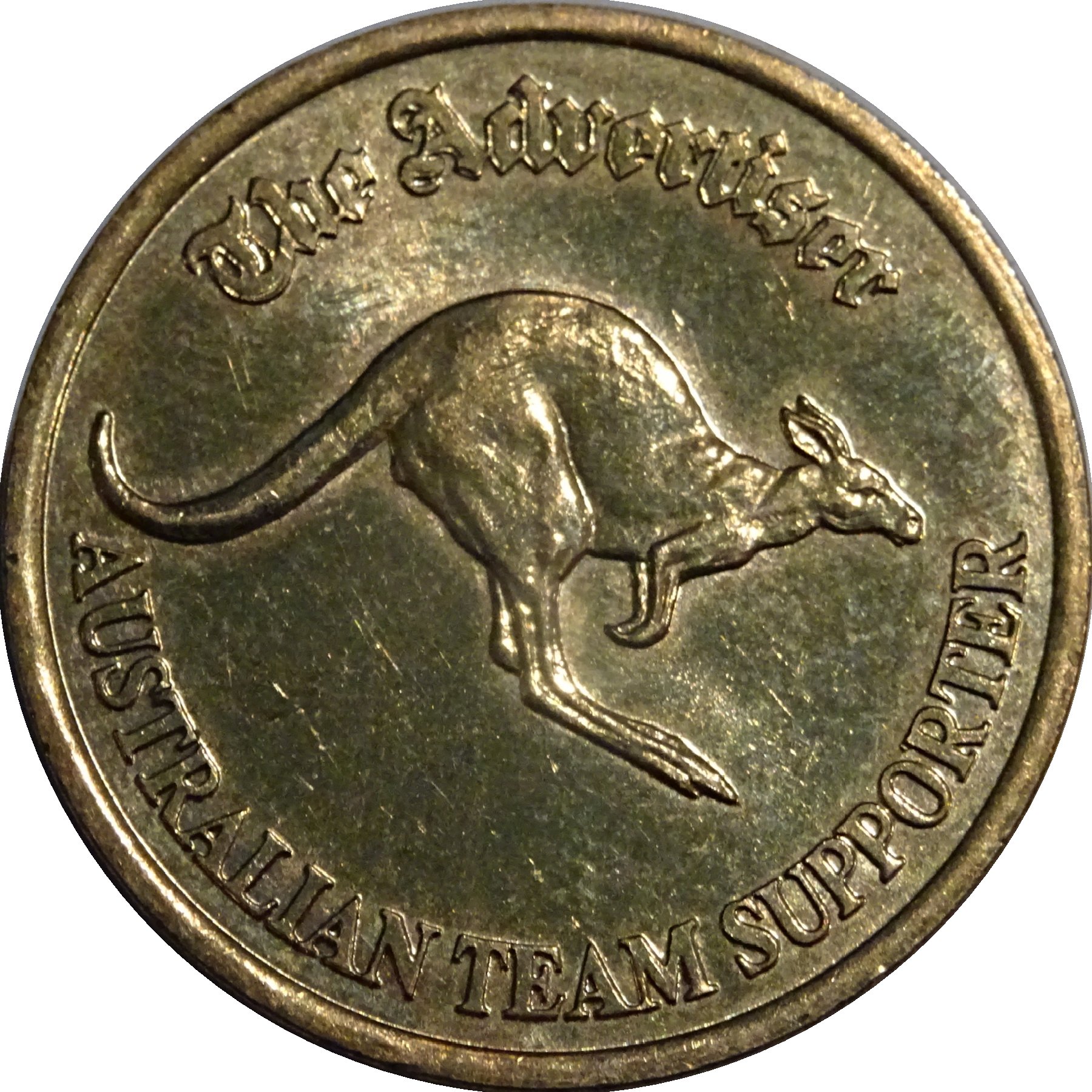 Описание: Верхній напис «The Advertiser». У центрі зображено кенгуру. Нижній напис «AUSTRALIAN TEAM SUPPORTER».